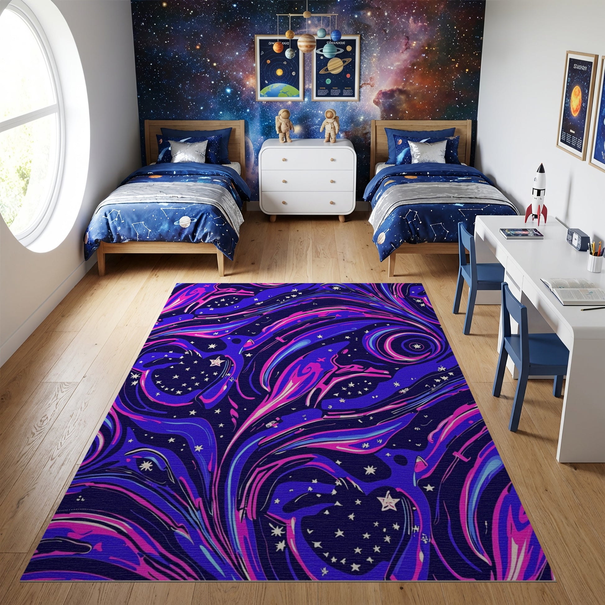 Flatwoven High Traffic Area Rug, Navy Purple Cosmic Swirling Birds Stars Rug, Non Slip, Stain Resistant, Washable Area Rugs for Study Room, Playroom, Bedroom Overview: