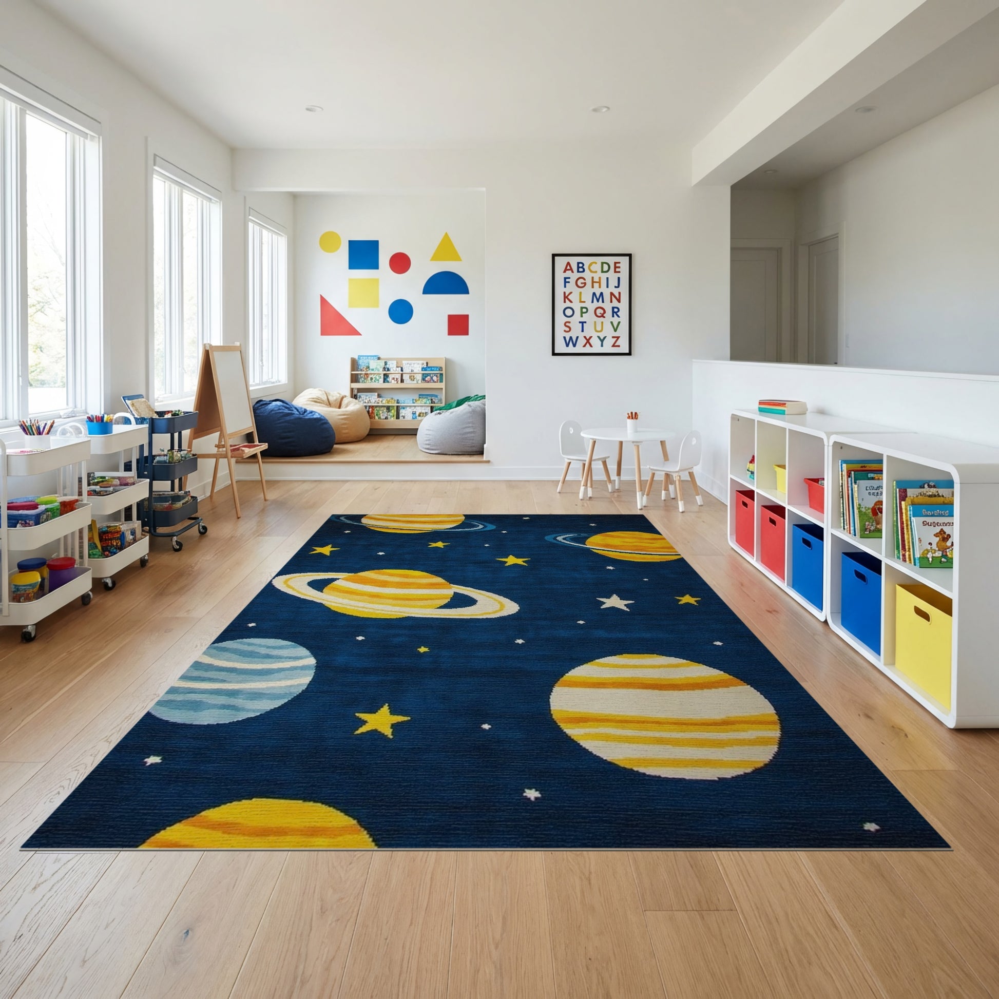 Flatwoven High Traffic Area Rug, Navy Ringed Planets Stars Cosmic Rug, Non Slip, Stain Resistant, Washable Area Rugs for Study Room, Playroom, Bedroom Overview: