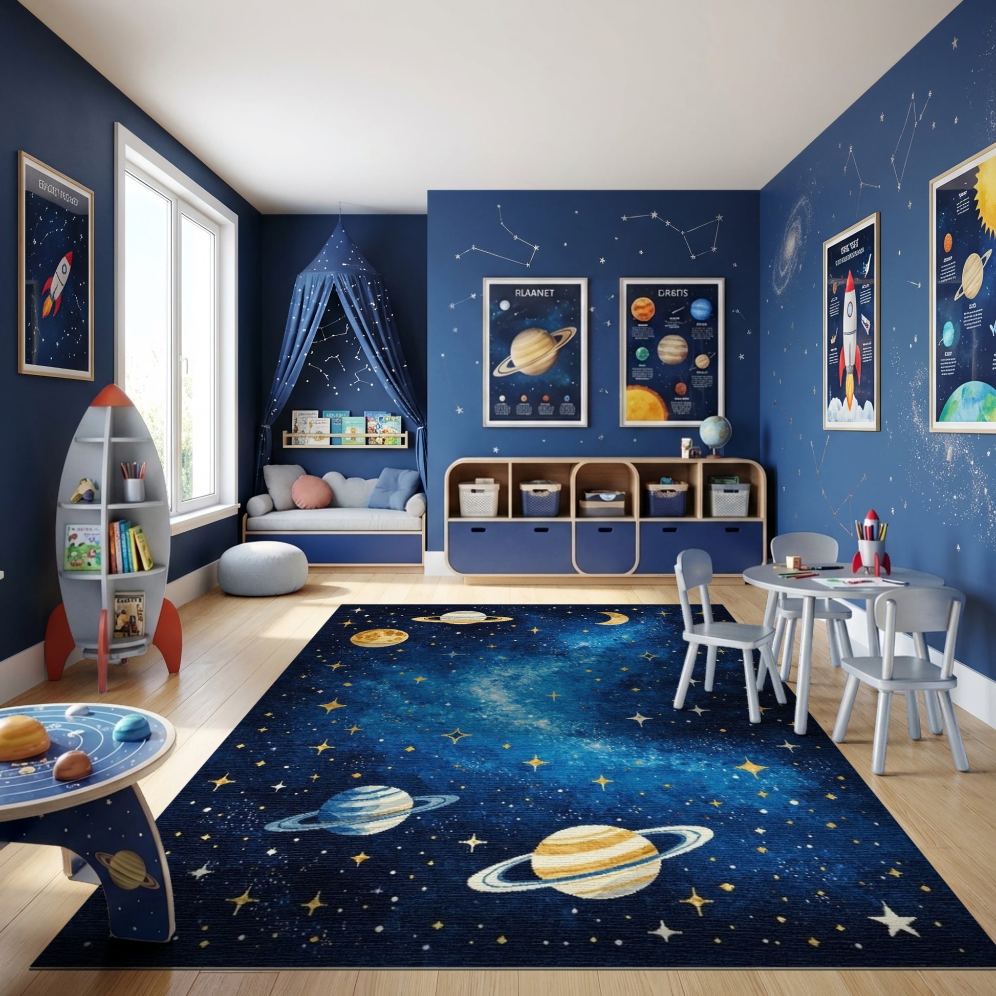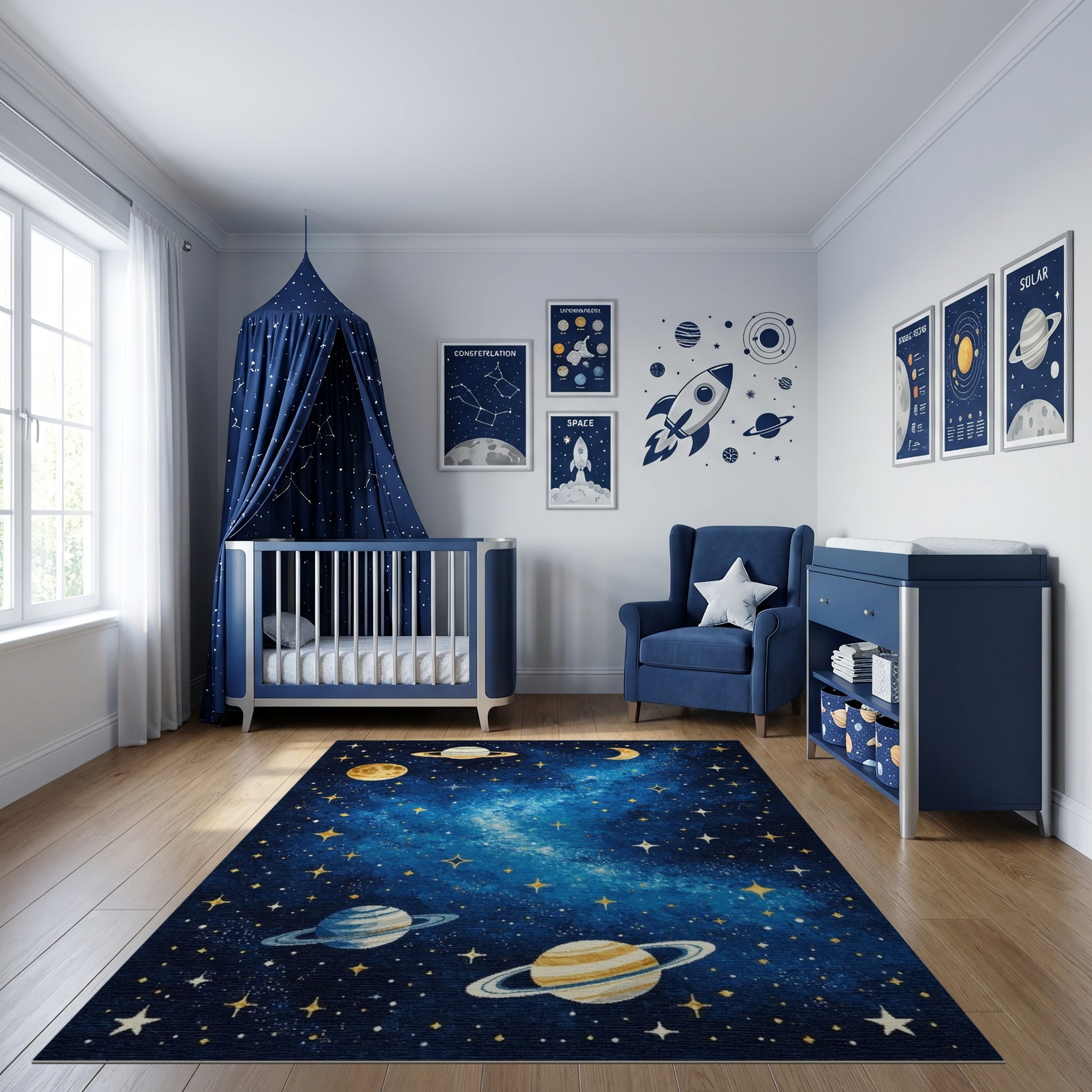 Flatwoven High Traffic Area Rug, Navy Starry Galaxy Planets Moon Rug, Non Slip, Stain Resistant, Washable Area Rugs for Study Room, Playroom, Bedroom Overview: