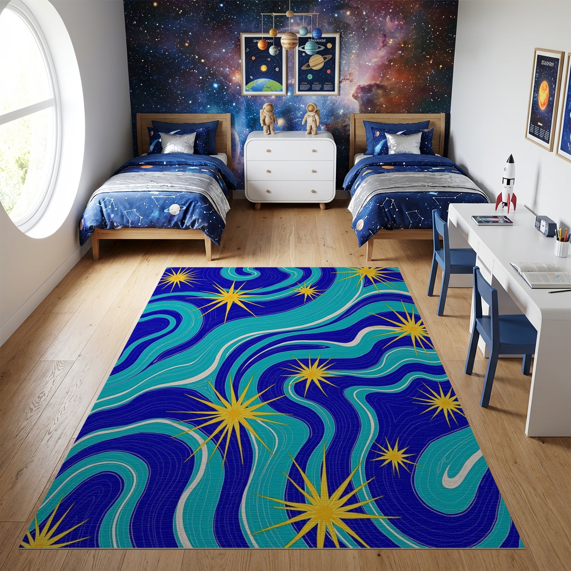 Flatwoven High Traffic Area Rug, Navy Teal Wavy Yellow Stars Rug, Non Slip, Stain Resistant, Washable Area Rugs for Study Room, Playroom, Bedroom Overview: