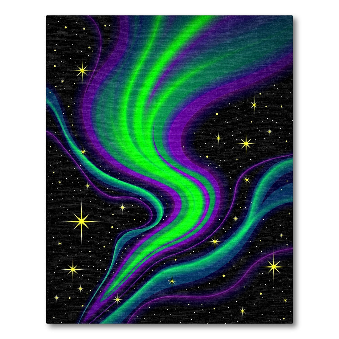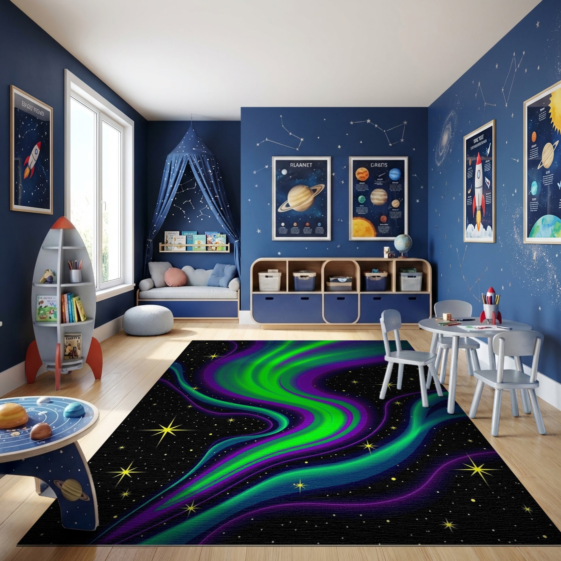 Flatwoven High Traffic Area Rug, Neon Aurora Waves Starry Rug, Non Slip, Stain Resistant, Washable Area Rugs for Study Room, Playroom, Bedroom Overview:
