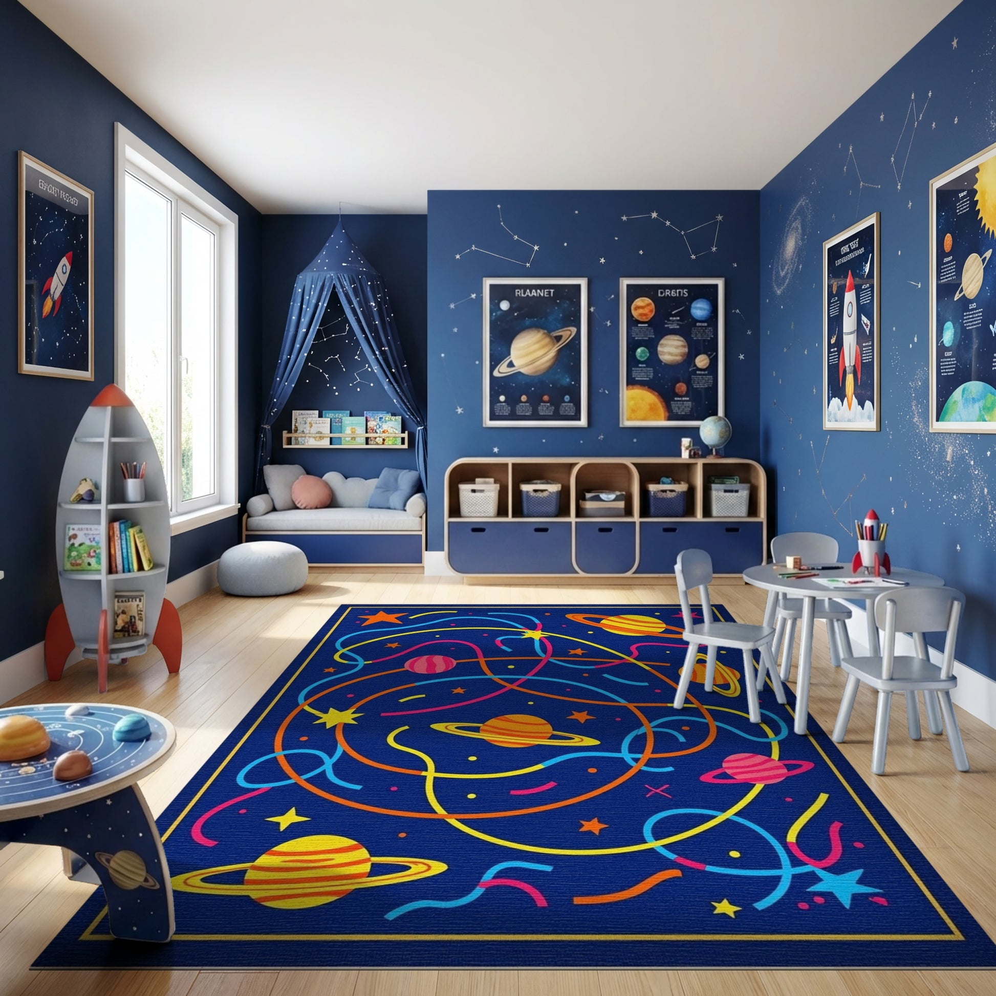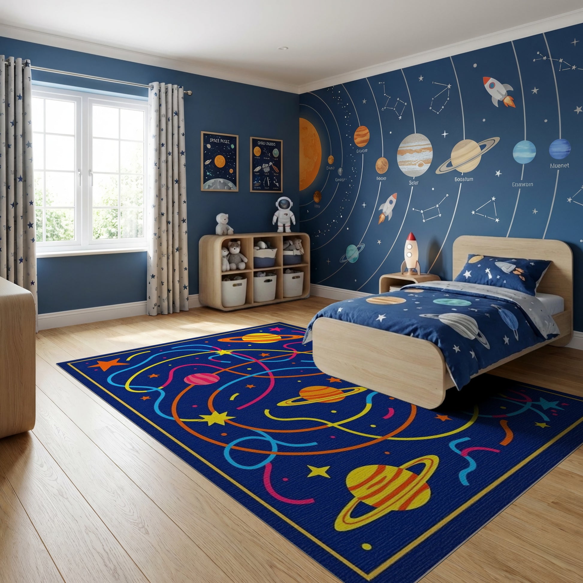 Flatwoven High Traffic Area Rug, Neon Cosmic Swirling Planets Stars Rug, Non Slip, Stain Resistant, Washable Area Rugs for Study Room, Playroom, Bedroom Overview:
