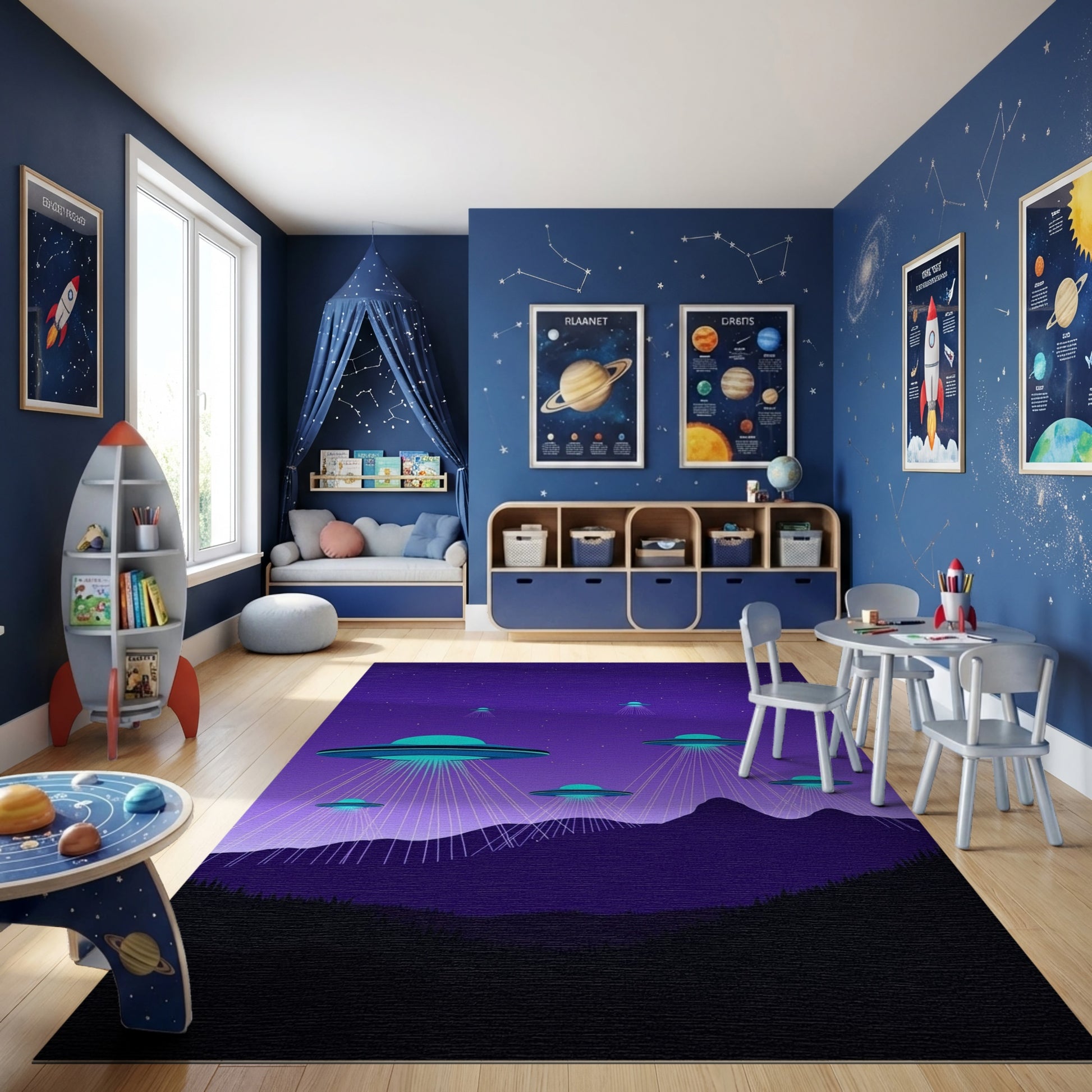 Flatwoven High Traffic Area Rug, Neon Glowing UFOs Purple Mountains Rug, Non Slip, Stain Resistant, Washable Area Rugs for Study Room, Playroom, Bedroom Overview: