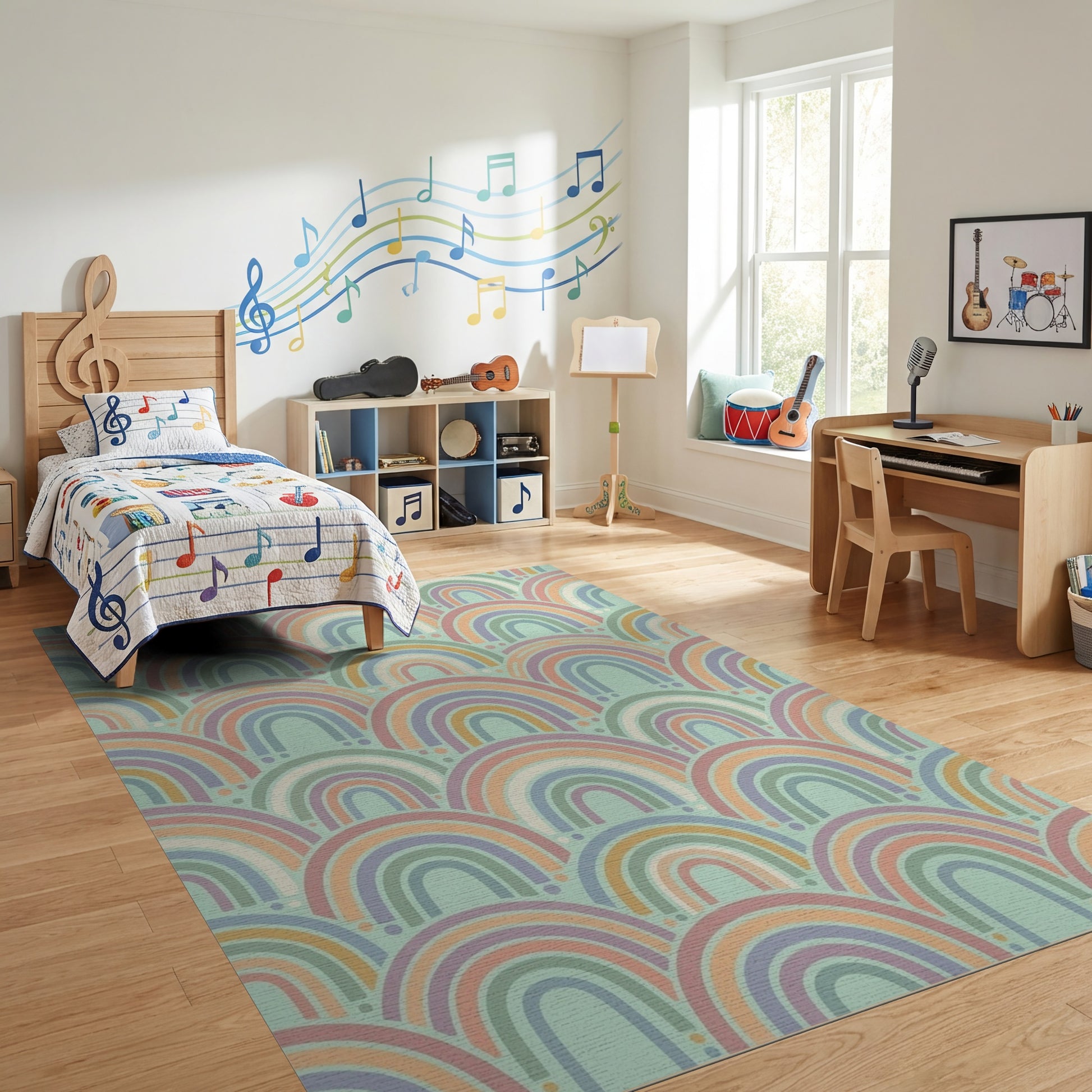 Flatwoven High Traffic Area Rug, Pastel Overlapping Arches Whimsical Rug, Non Slip, Stain Resistant, Washable Area Rugs for Study Room, Playroom, Bedroom Overview: