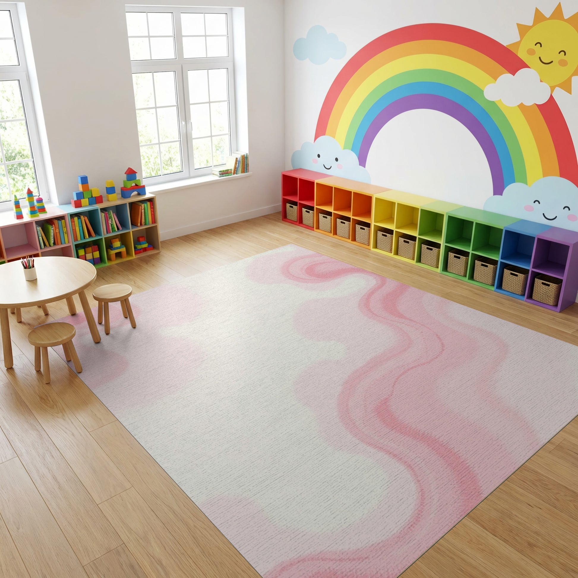 Flatwoven High Traffic Area Rug, Pastel Pink Fluid Waves Rug, Non Slip, Stain Resistant, Washable Area Rugs for Study Room, Playroom, Bedroom Overview:
