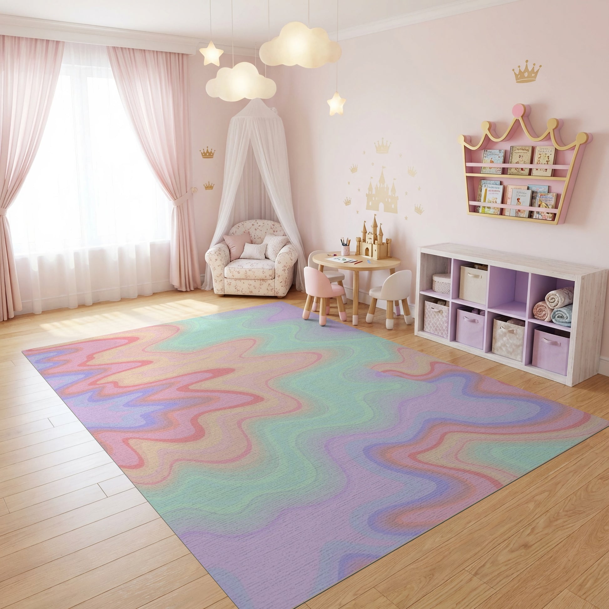 Flatwoven High Traffic Area Rug, Pastel Wavy Fluid Gradient Rug, Non Slip, Stain Resistant, Washable Area Rugs for Study Room, Playroom, Bedroom Overview: