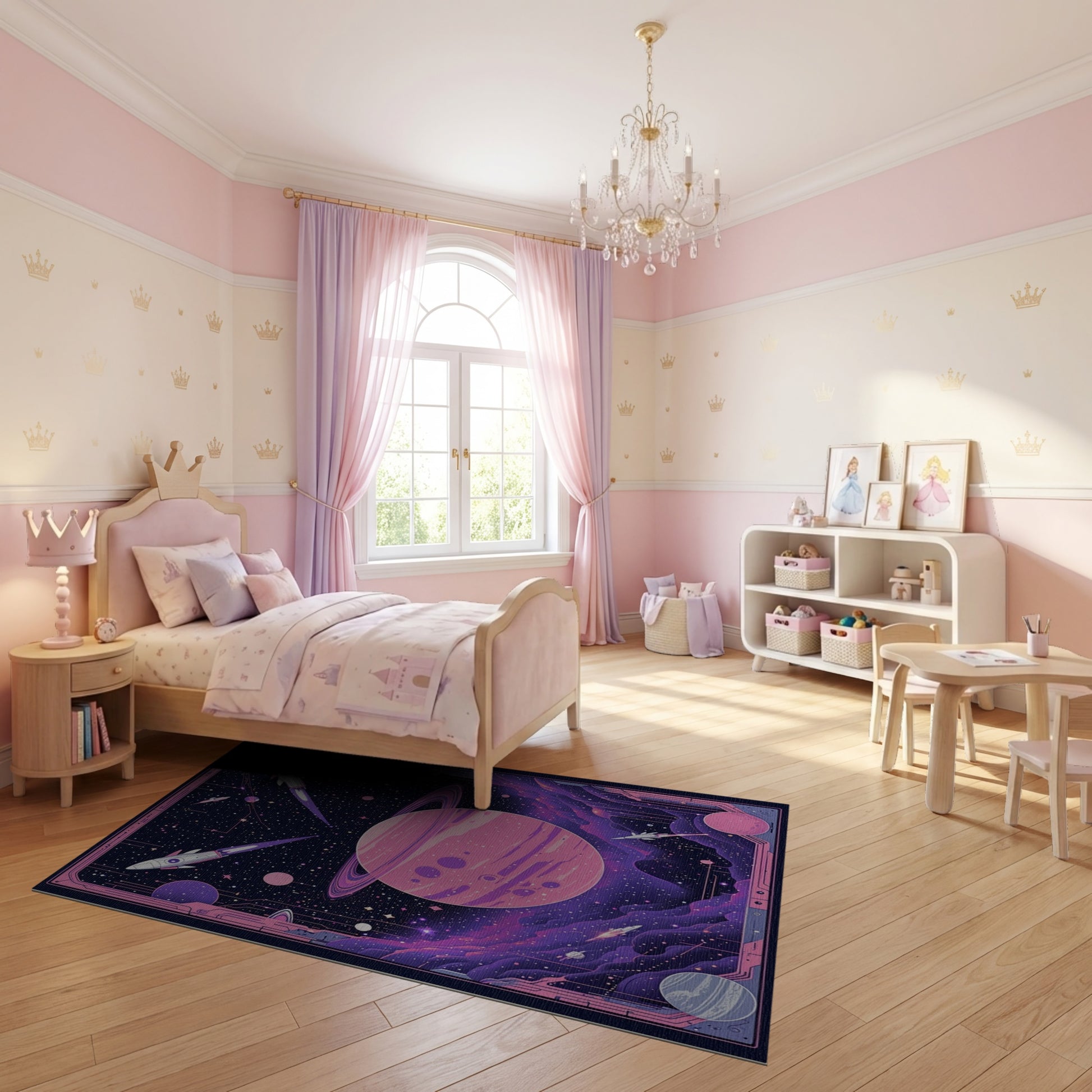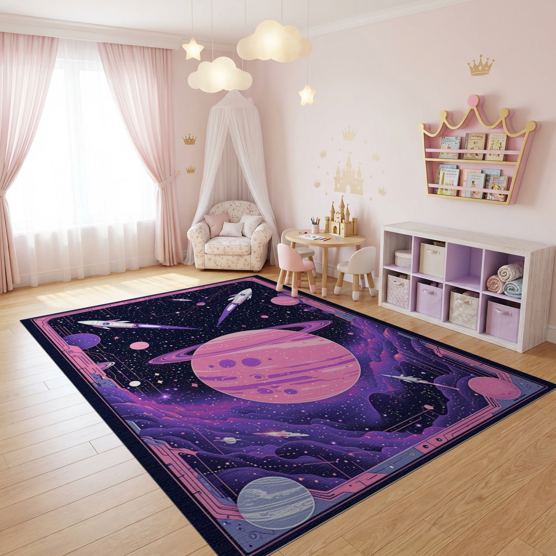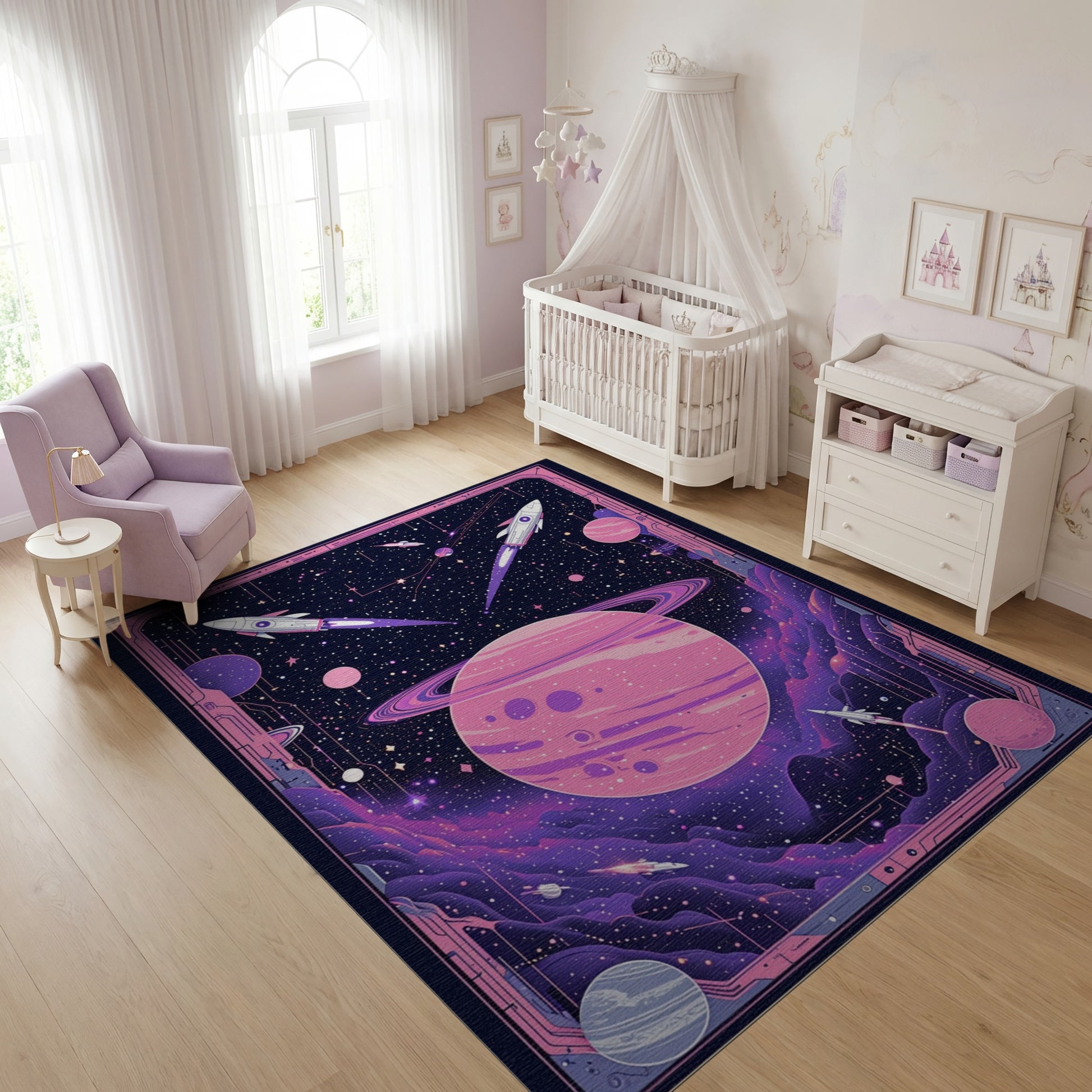 Flatwoven High Traffic Area Rug, Pink Saturn Rockets Cosmic Nebula Rug, Non Slip, Stain Resistant, Washable Area Rugs for Study Room, Playroom, Bedroom Overview: