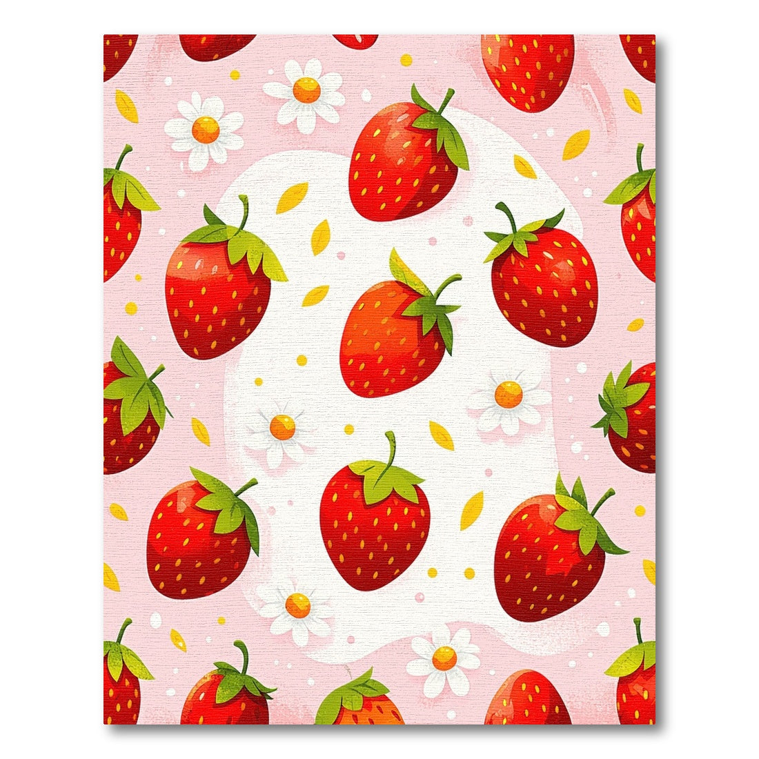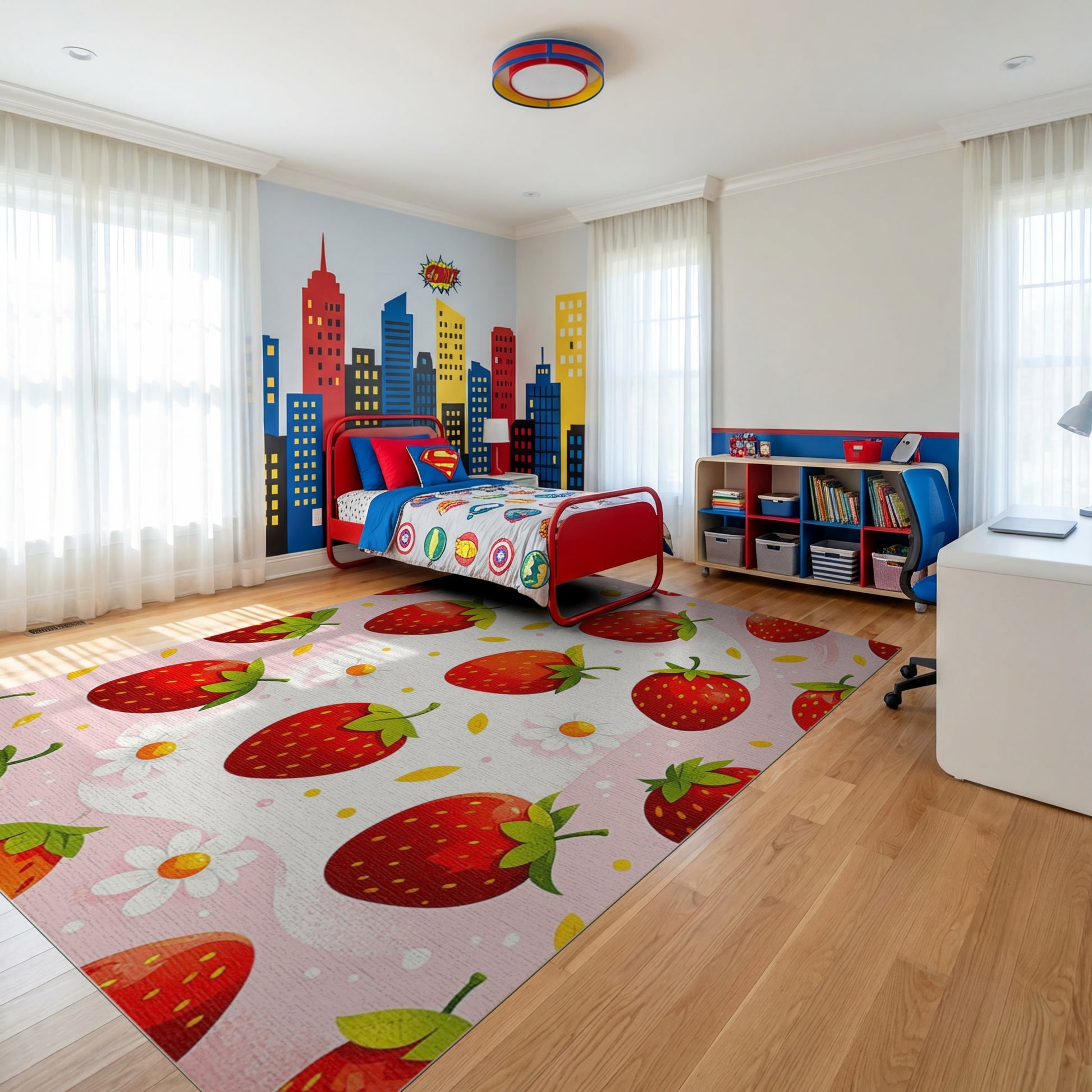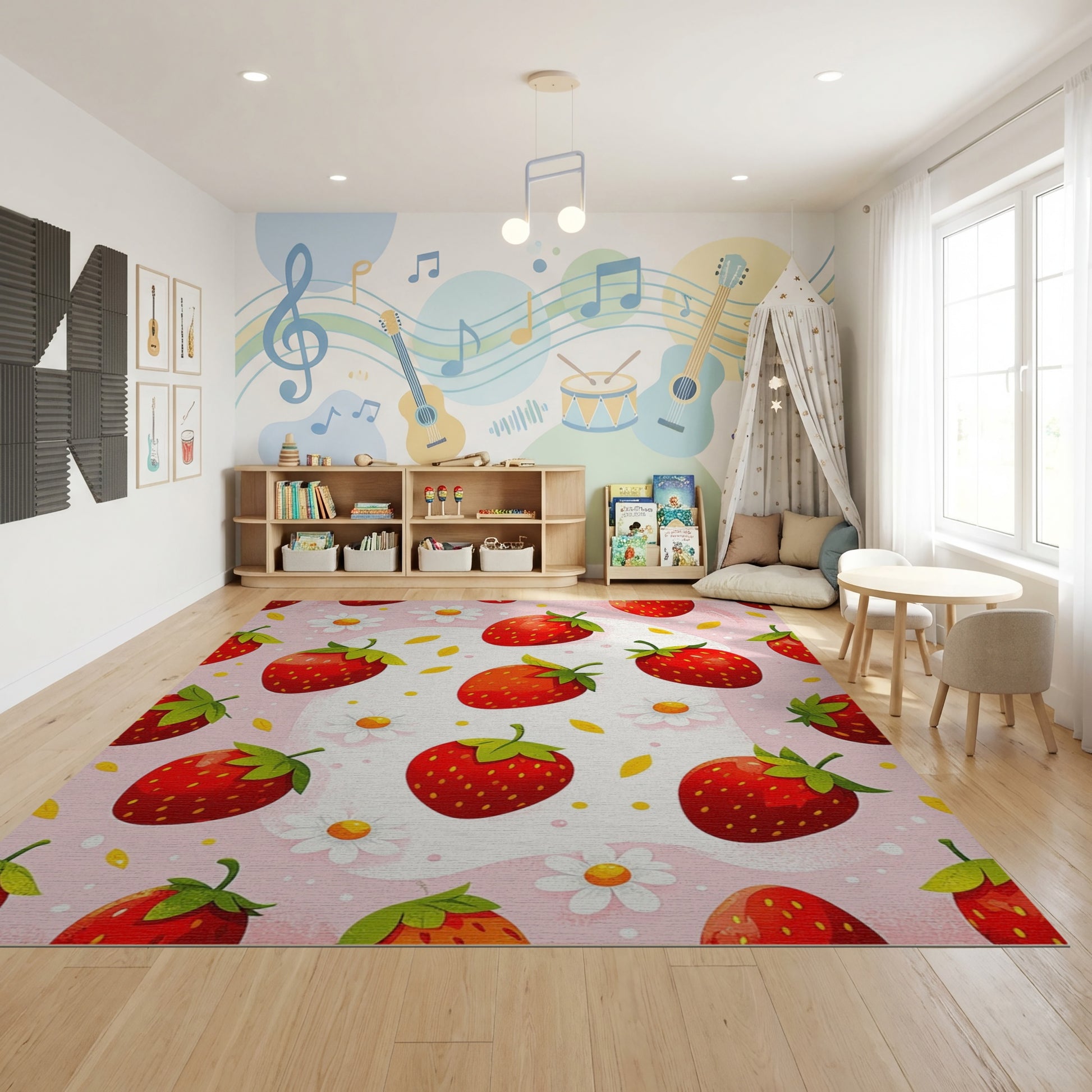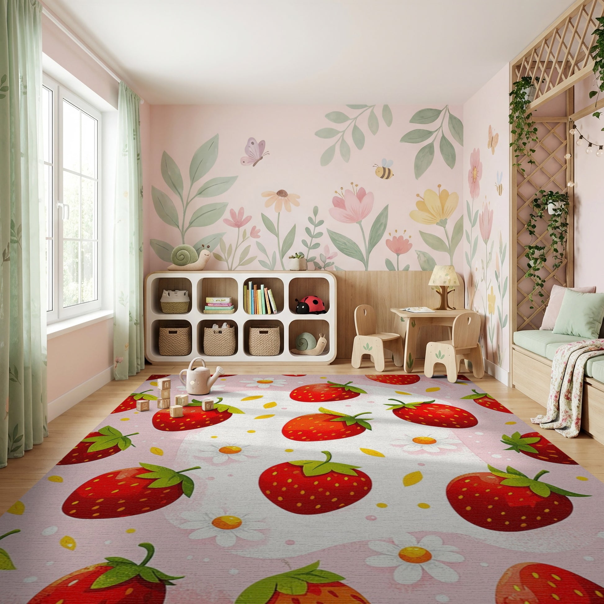 Flatwoven High Traffic Area Rug, Pink Strawberry Daisy Whimsical Rug, Non Slip, Stain Resistant, Washable Area Rugs for Study Room, Playroom, Bedroom Overview: