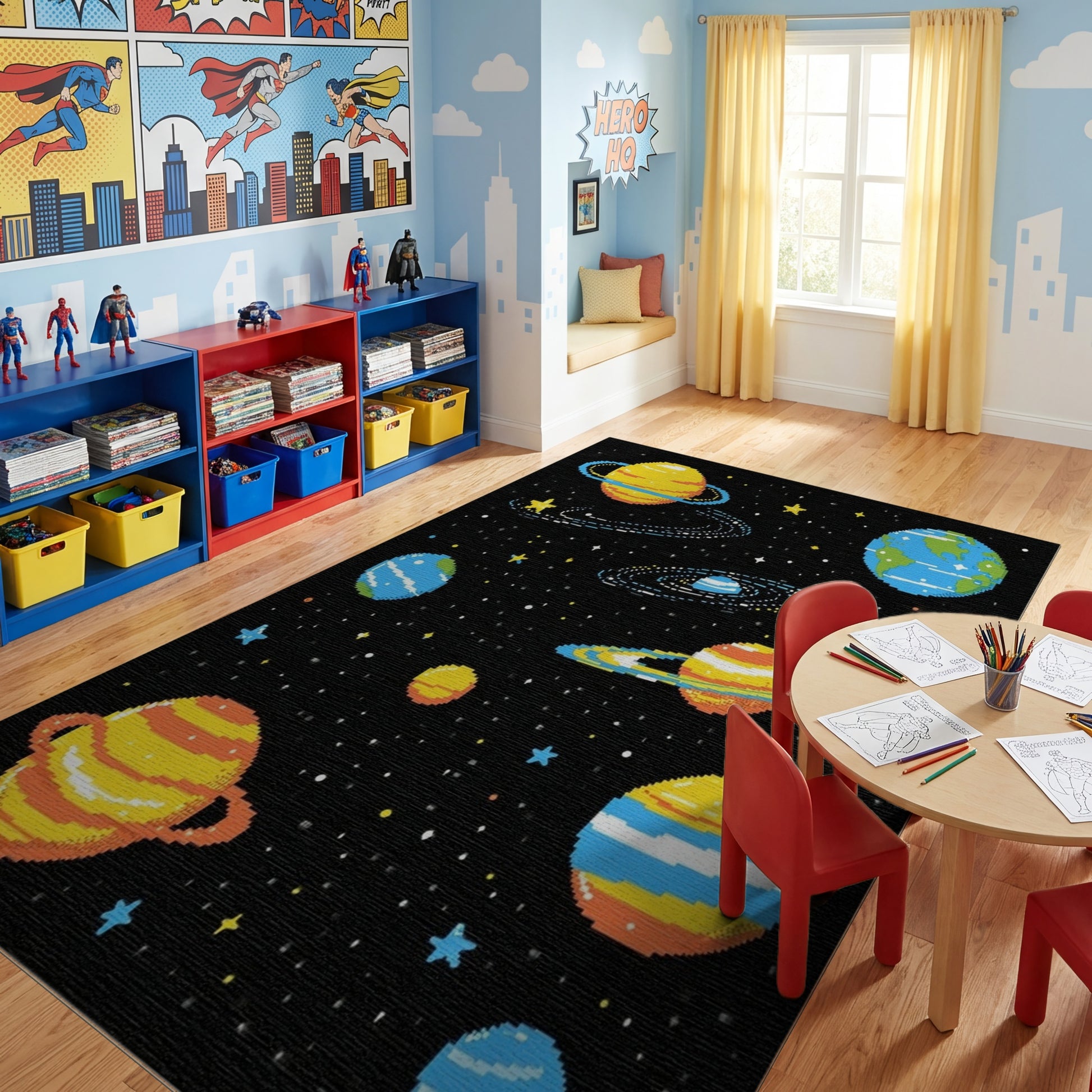 Flatwoven High Traffic Area Rug, Pixelated Cosmic Planets Stars Rug 2, Non Slip, Stain Resistant, Washable Area Rugs for Study Room, Playroom, Bedroom Overview:
