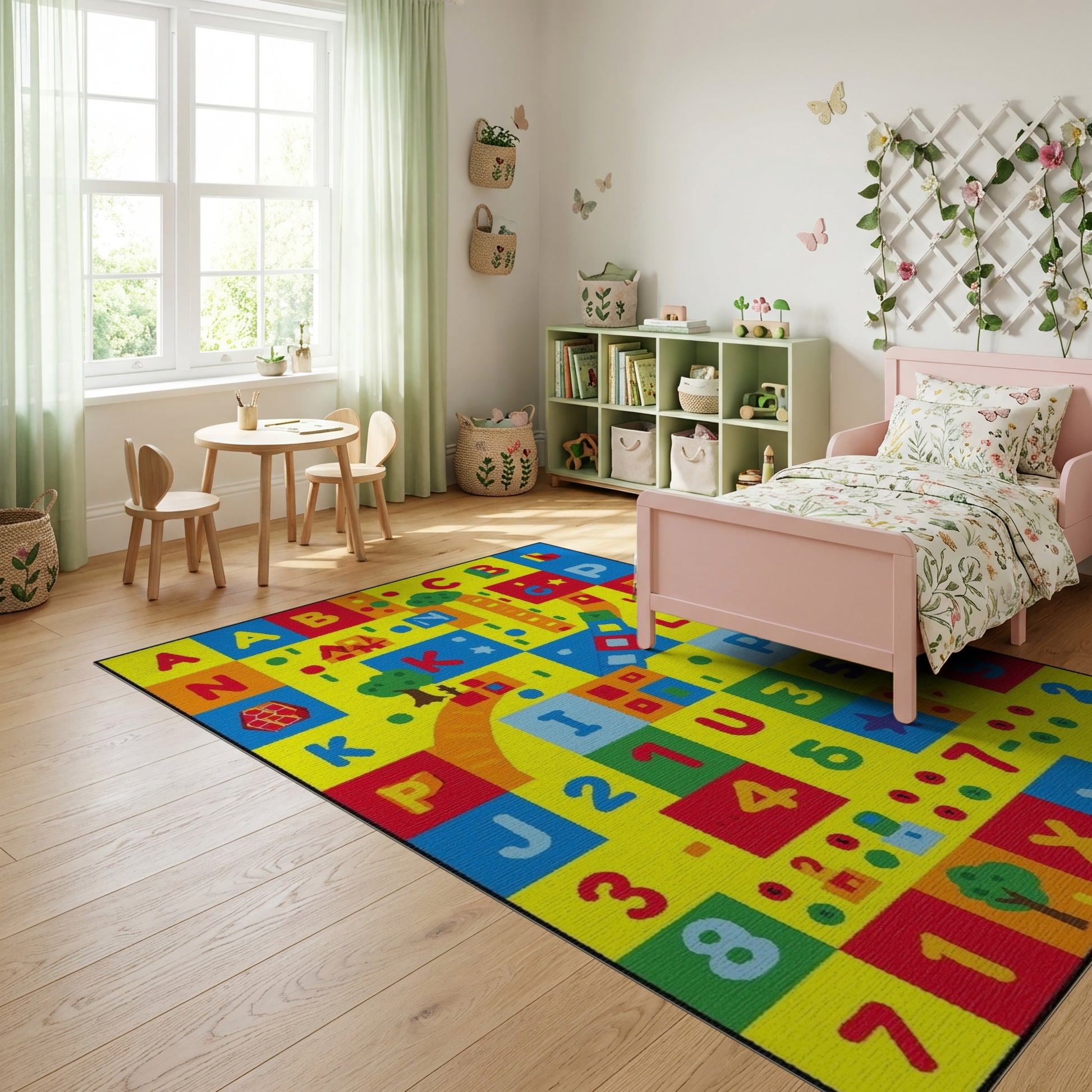 Flatwoven High Traffic Area Rug, Playful Alphabet Numbers Road Rug, Non Slip, Stain Resistant, Washable Area Rugs for Study Room, Playroom, Bedroom Overview:
