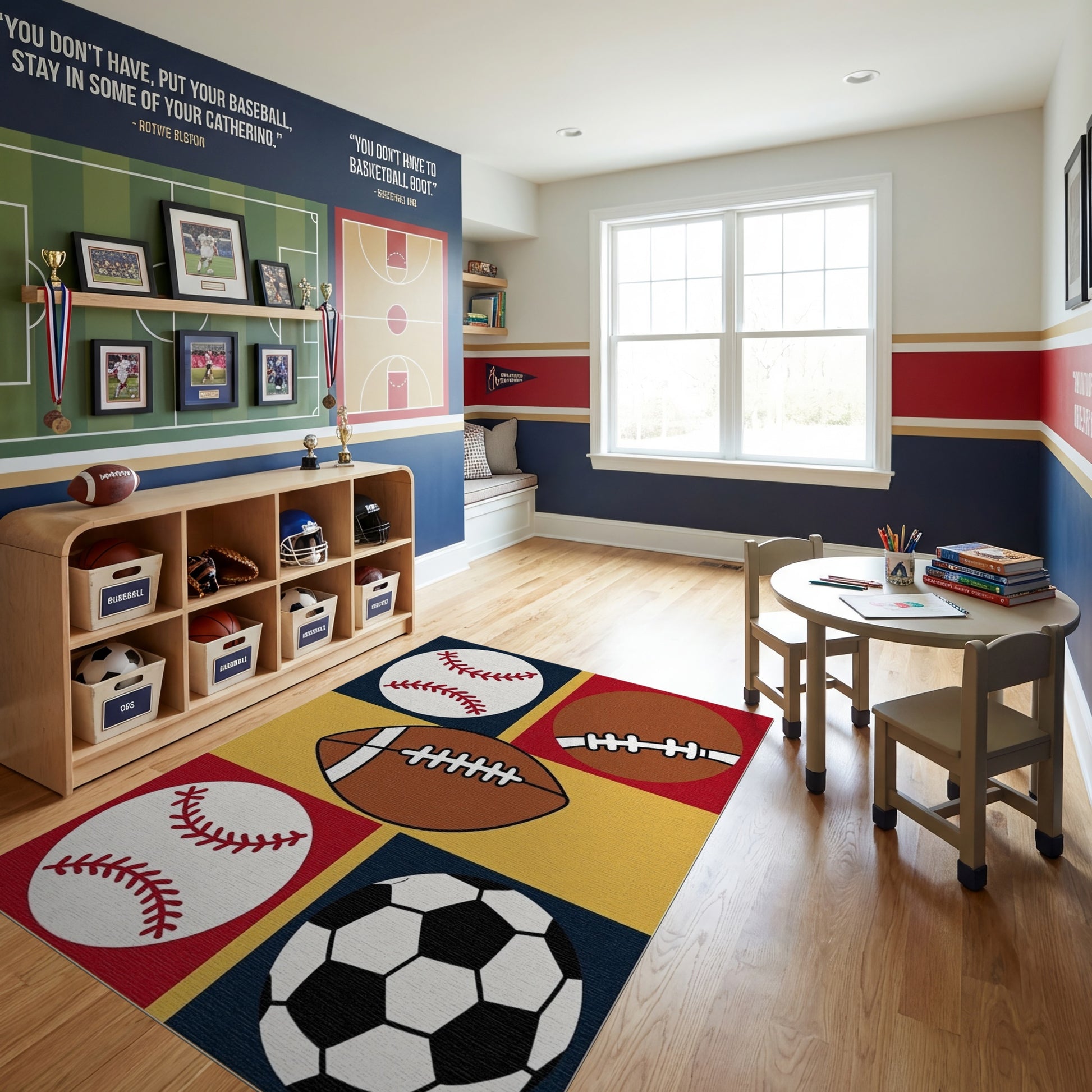 Flatwoven High Traffic Area Rug, Playful Baseball Football Soccer Grid Rug, Non Slip, Stain Resistant, Washable Area Rugs for Study Room, Playroom, Bedroom Overview: