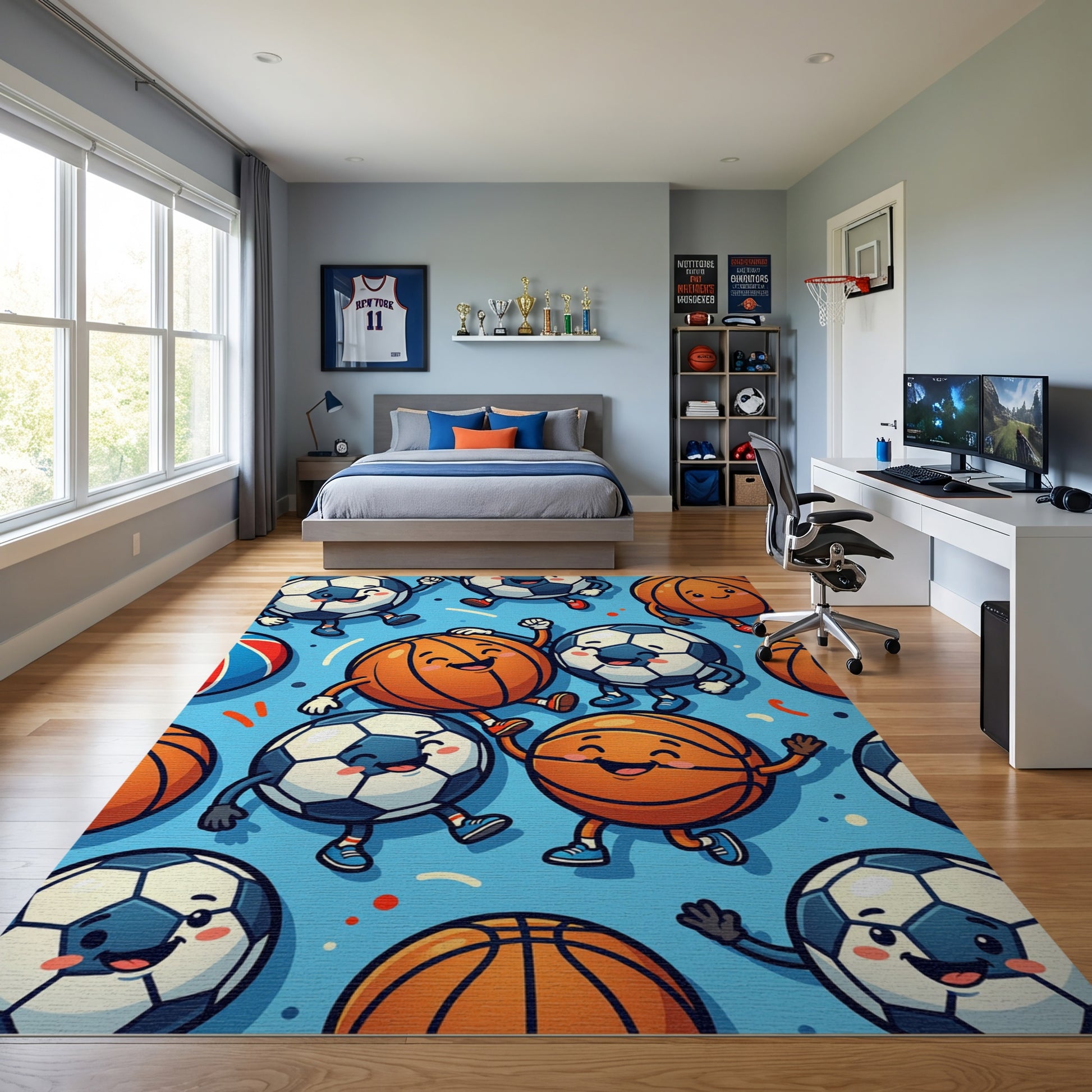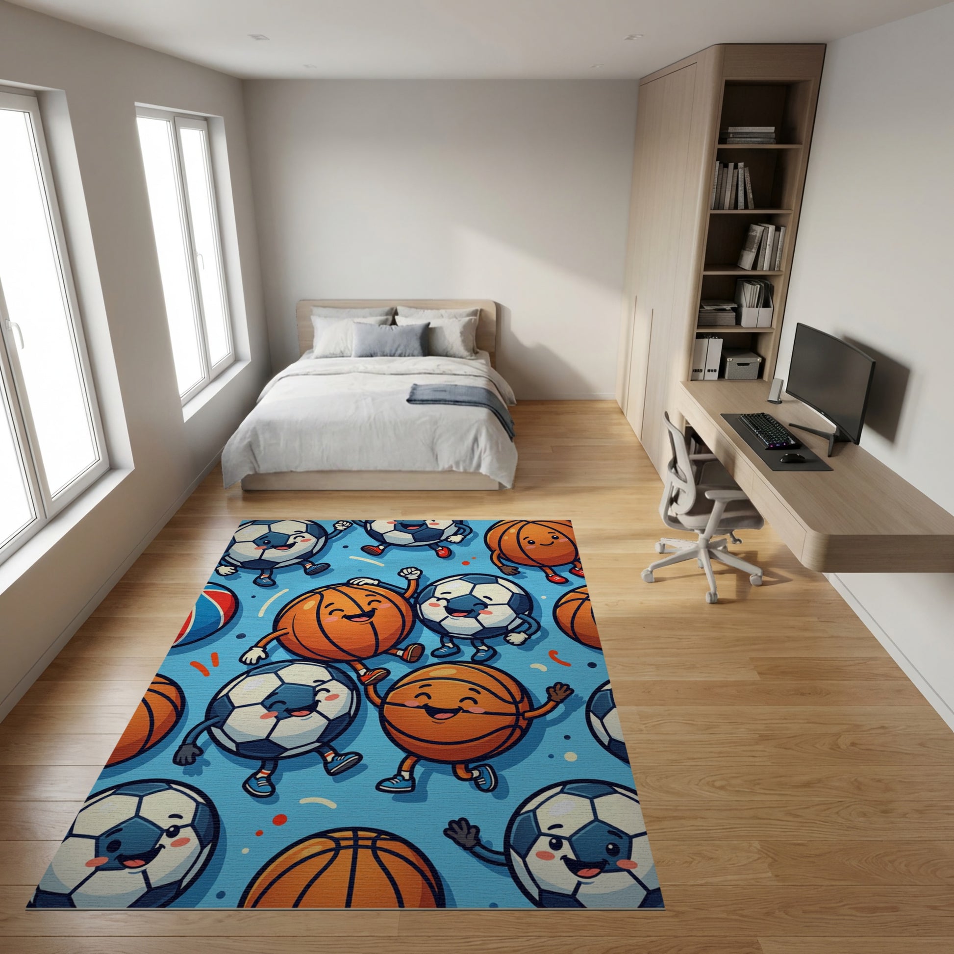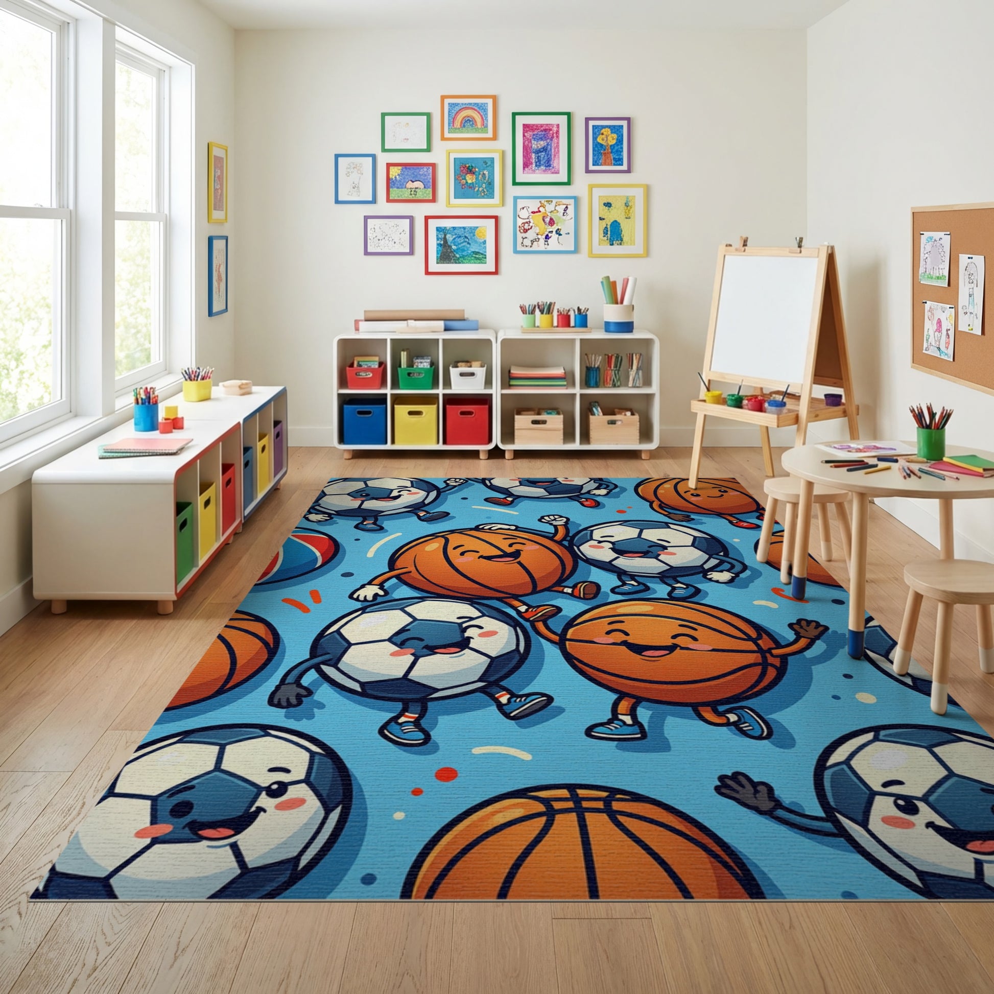 Playful Cartoon Soccer Basketball Dancing Rug