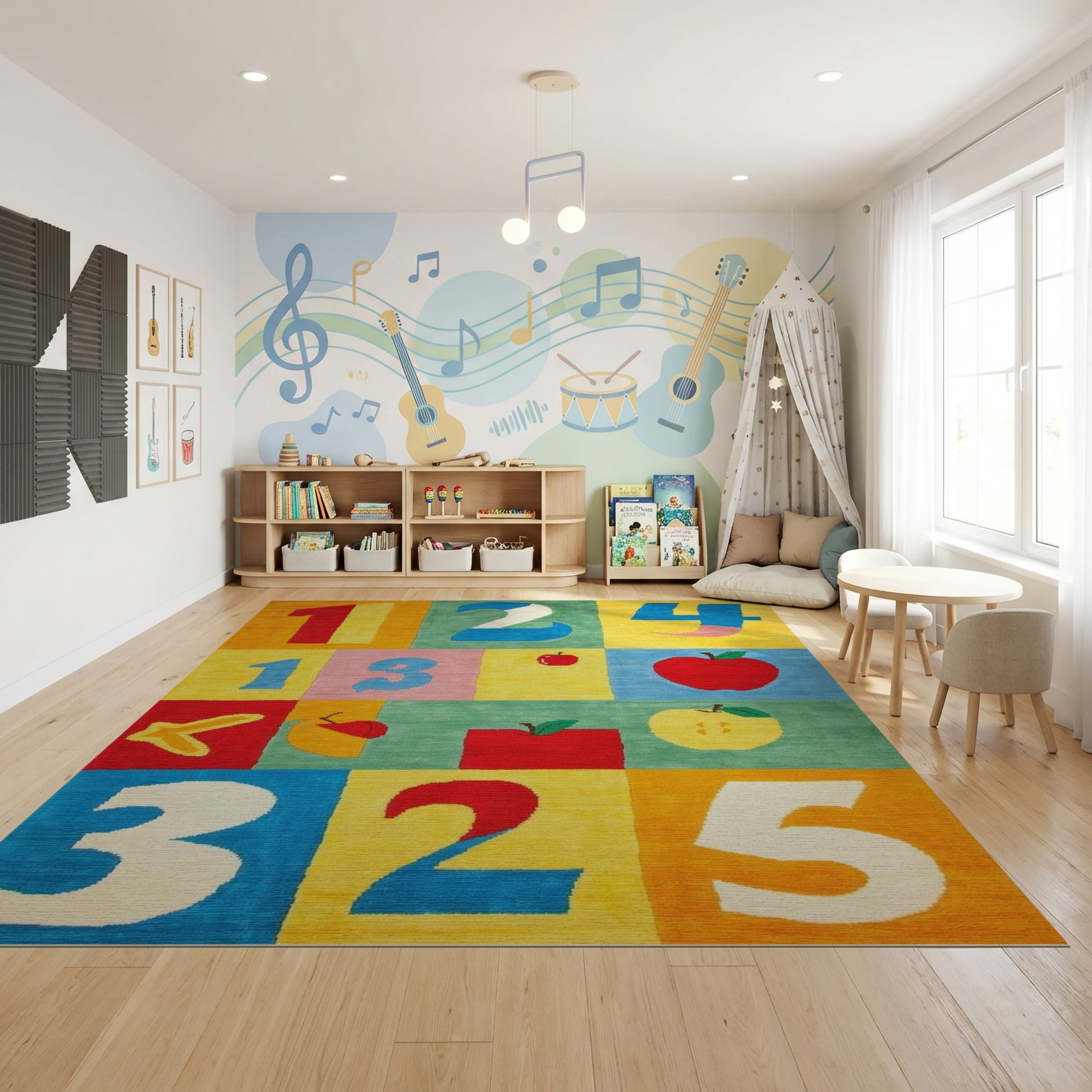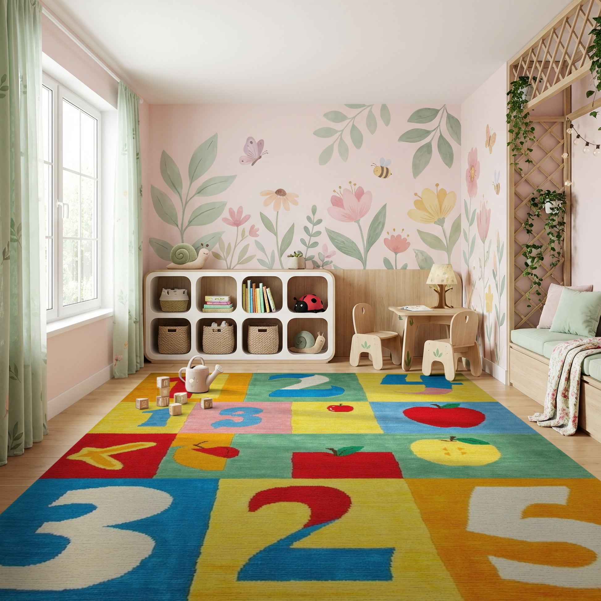 Flatwoven High Traffic Area Rug, Playful Color Block Numbers Apples Rug, Non Slip, Stain Resistant, Washable Area Rugs for Study Room, Playroom, Bedroom Overview: