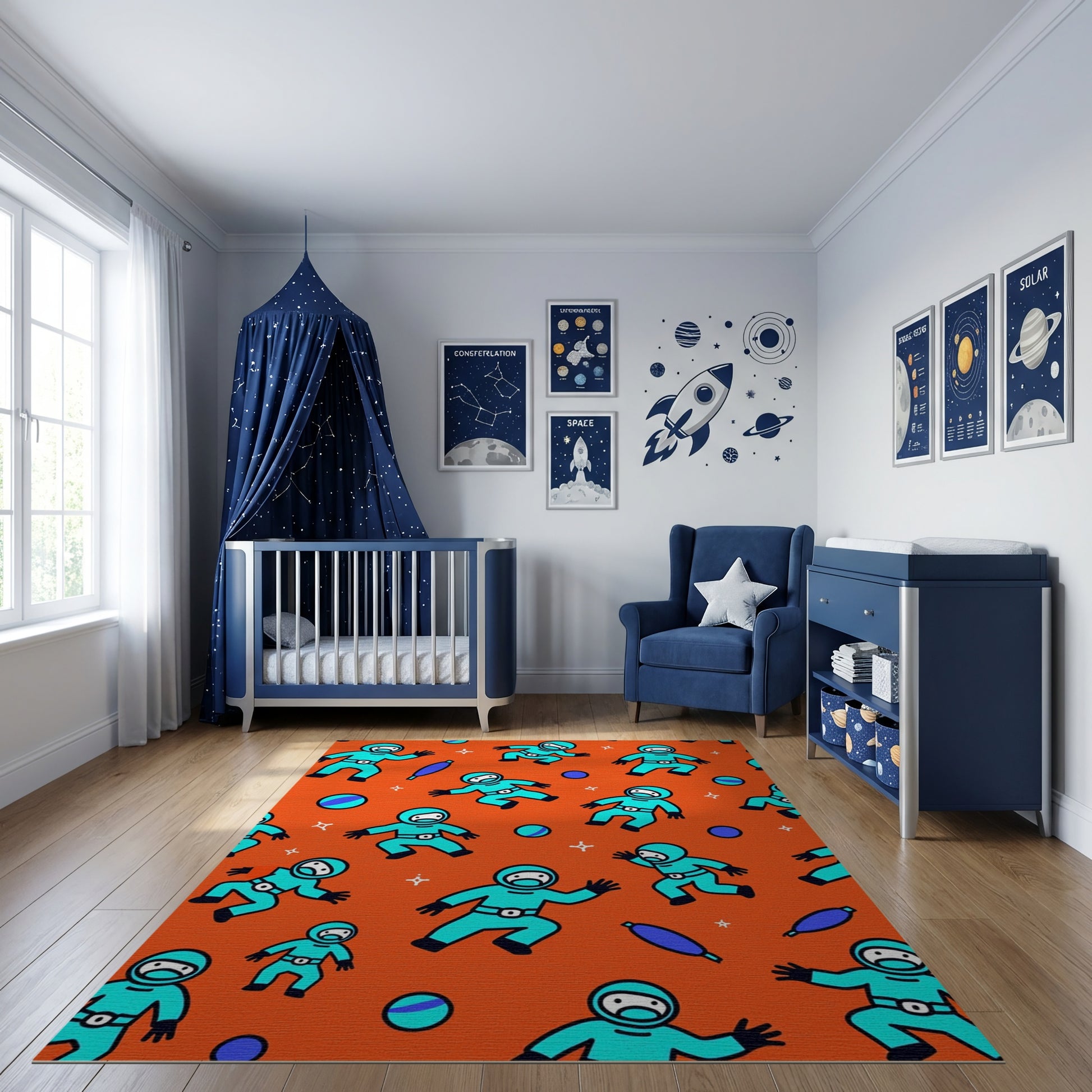 Playful Cyan Astronauts Orange Stars Rug
