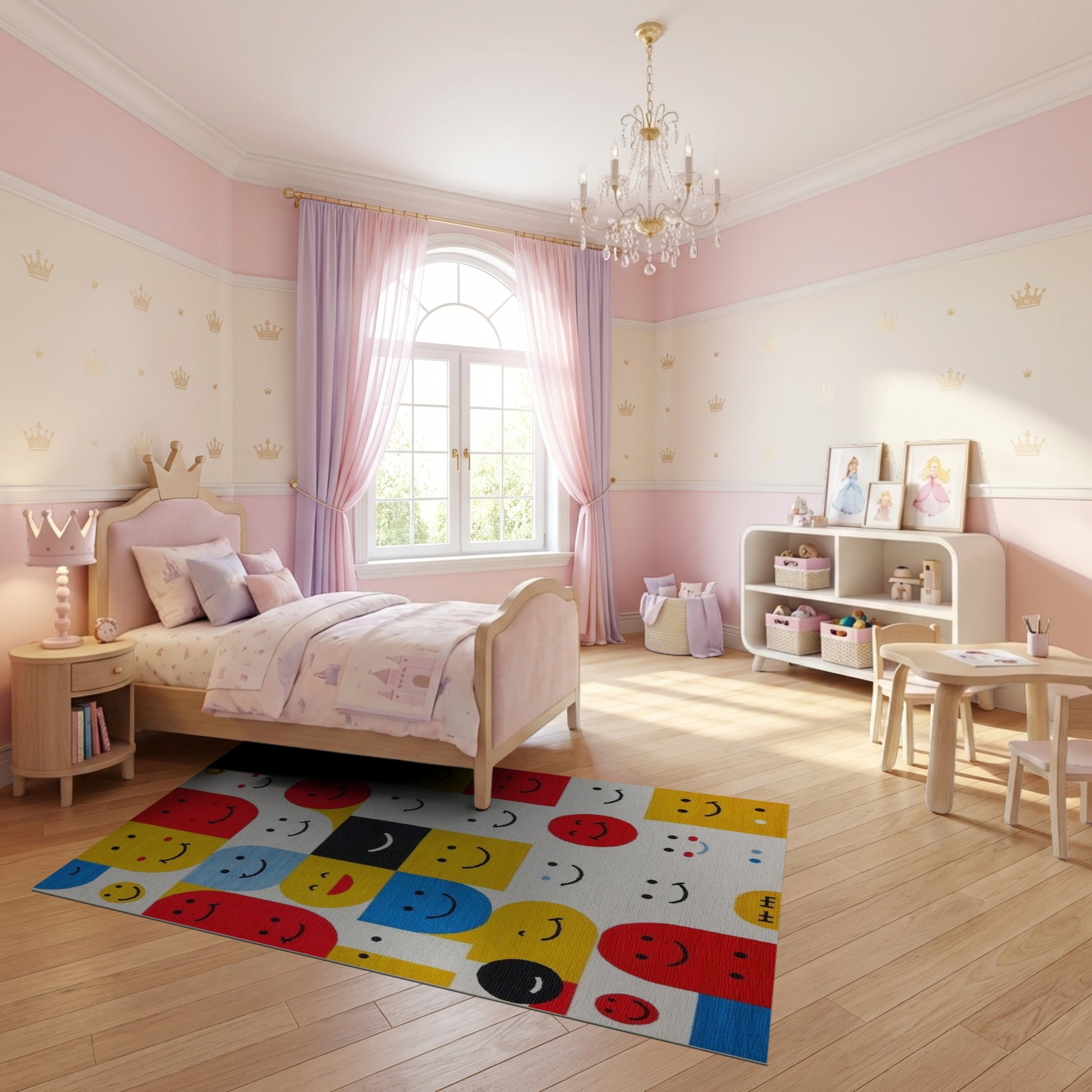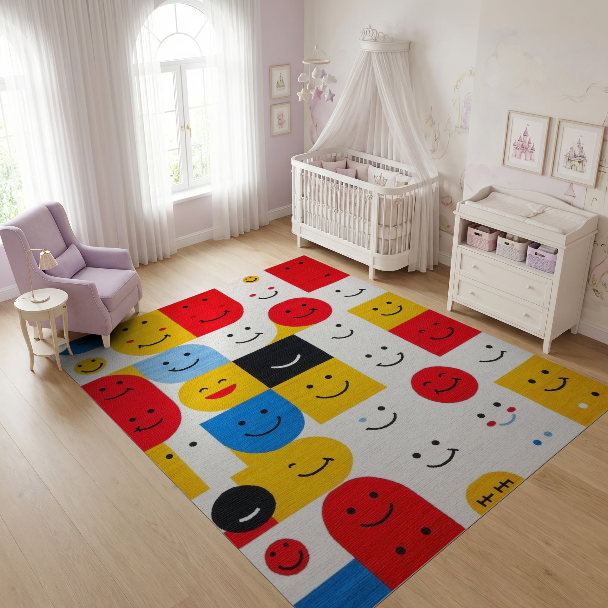 Flatwoven High Traffic Area Rug, Playful Geometric Smiling Faces Rug, Non Slip, Stain Resistant, Washable Area Rugs for Study Room, Playroom, Bedroom Overview: