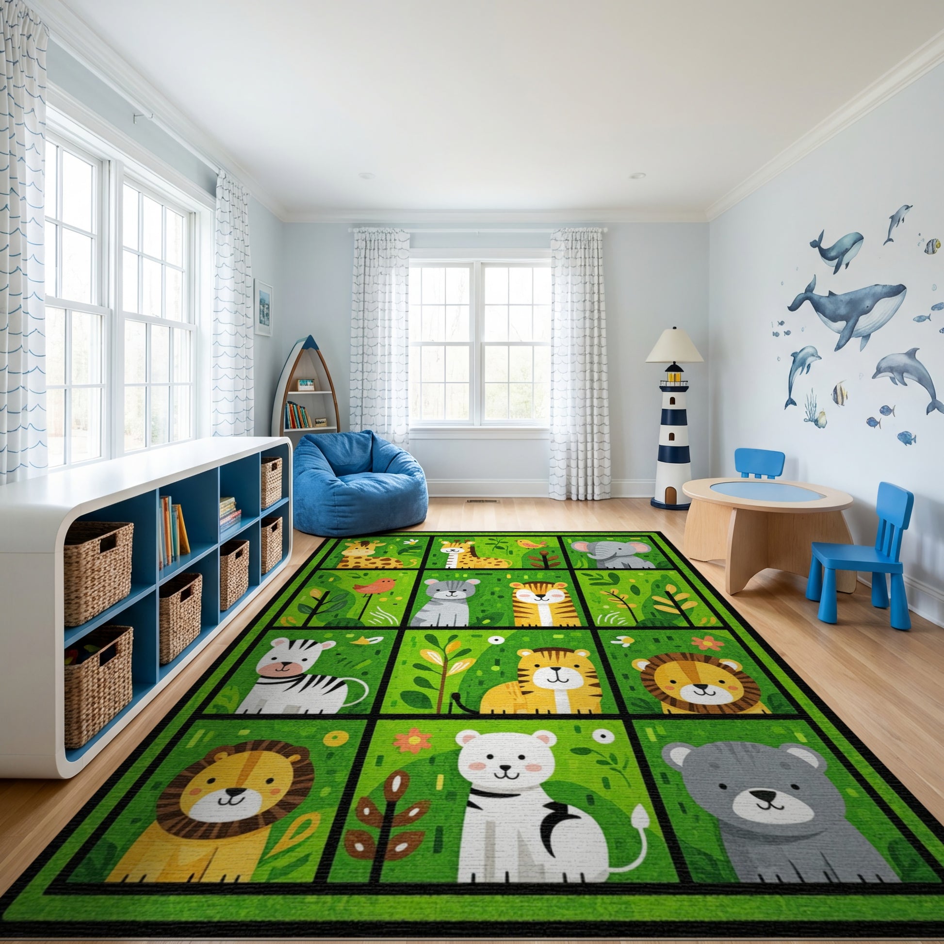 Flatwoven High Traffic Area Rug, Playful Green Cartoon Jungle Animals Rug, Non Slip, Stain Resistant, Washable Area Rugs for Study Room, Playroom, Bedroom Overview: