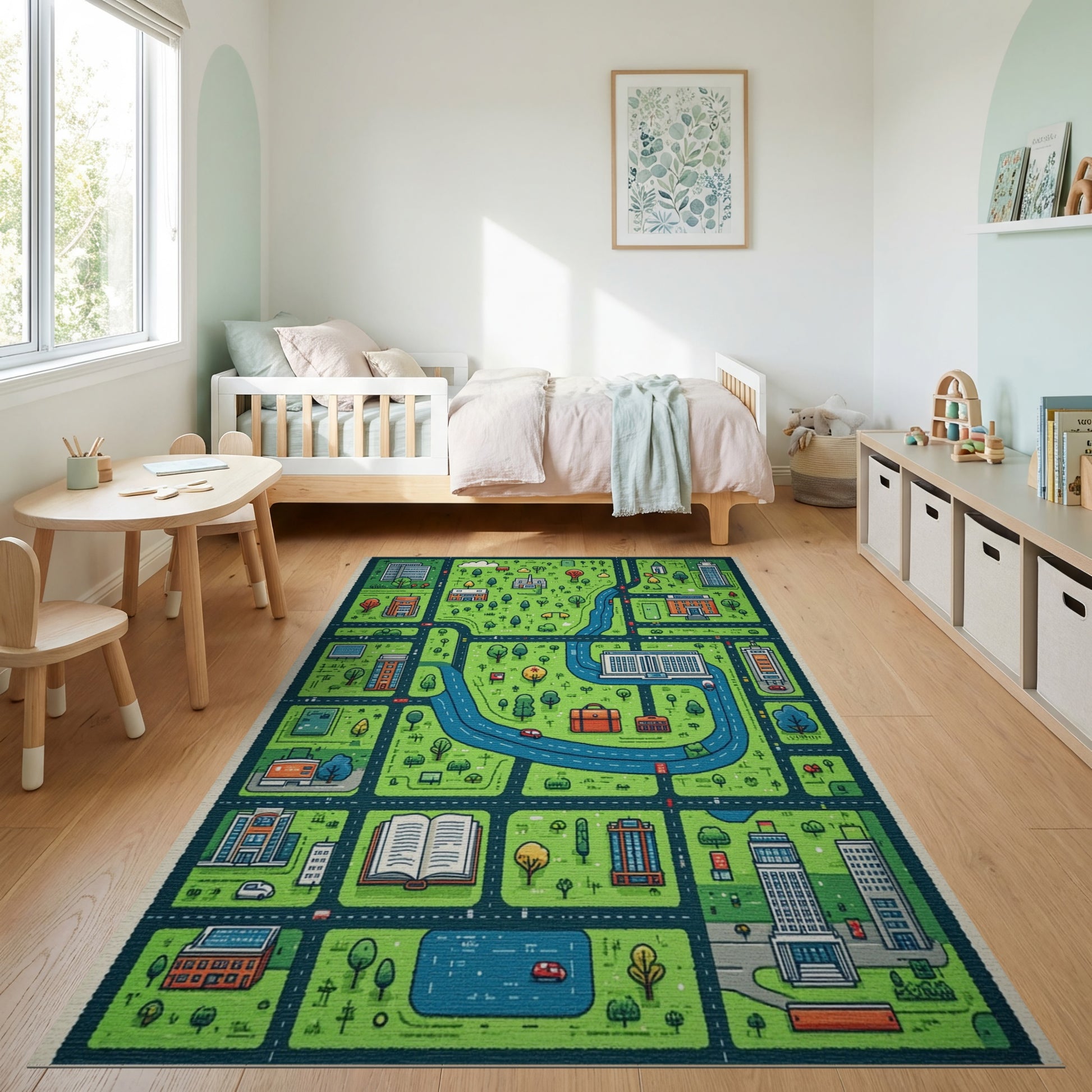 Flatwoven High Traffic Area Rug, Playful Green City Map Rug, Non Slip, Stain Resistant, Washable Area Rugs for Study Room, Playroom, Bedroom Overview: