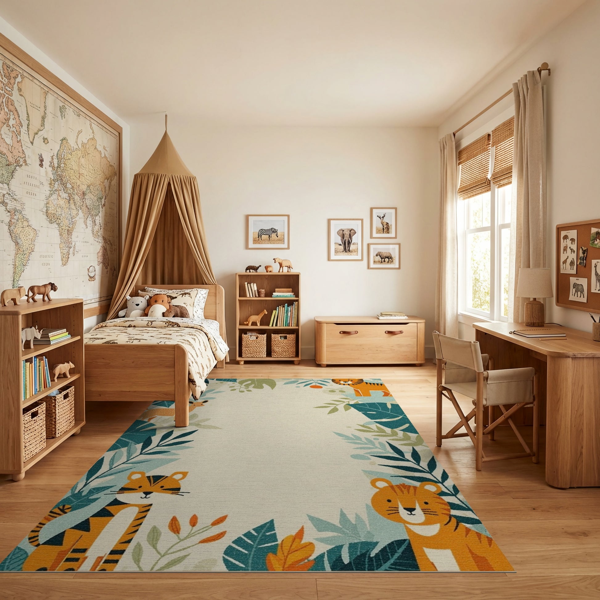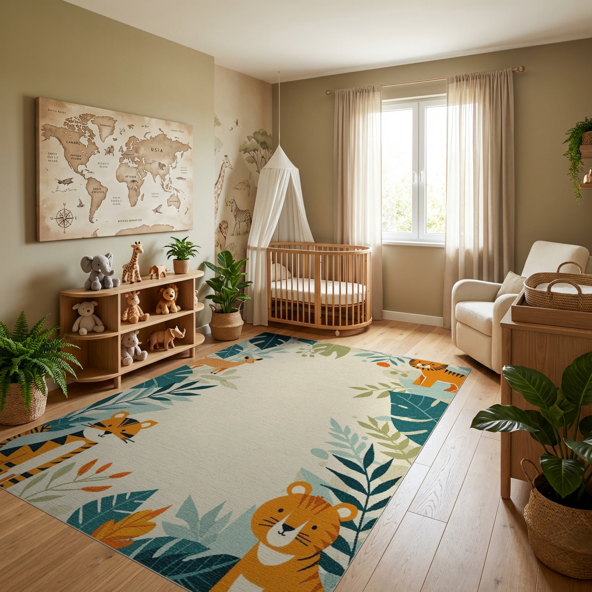 Flatwoven High Traffic Area Rug, Playful Orange Tigers Deer Leafy Jungle Rug, Non Slip, Stain Resistant, Washable Area Rugs for Study Room, Playroom, Bedroom Overview:
