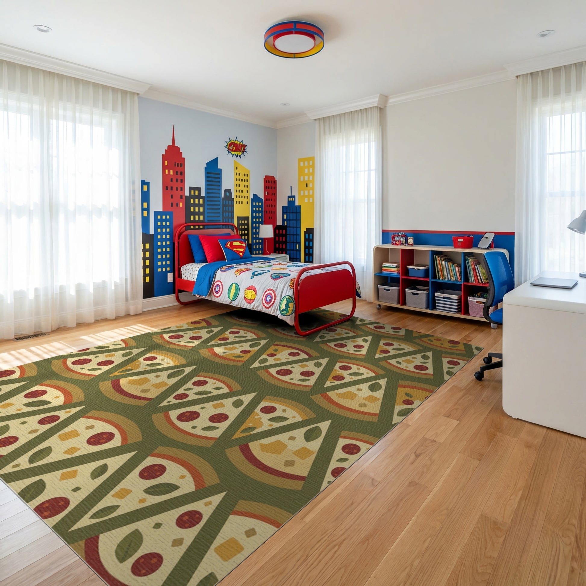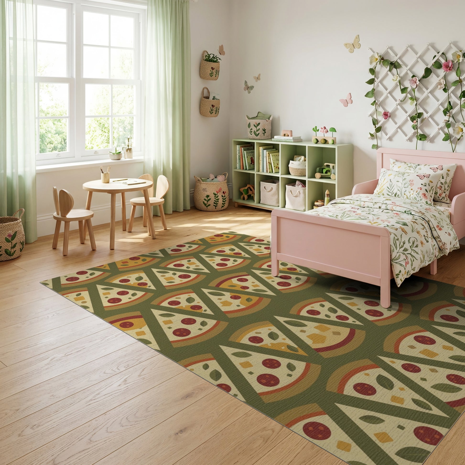 Flatwoven High Traffic Area Rug, Playful Pepperoni Pizza Slices Rug, Non Slip, Stain Resistant, Washable Area Rugs for Study Room, Playroom, Bedroom Overview: