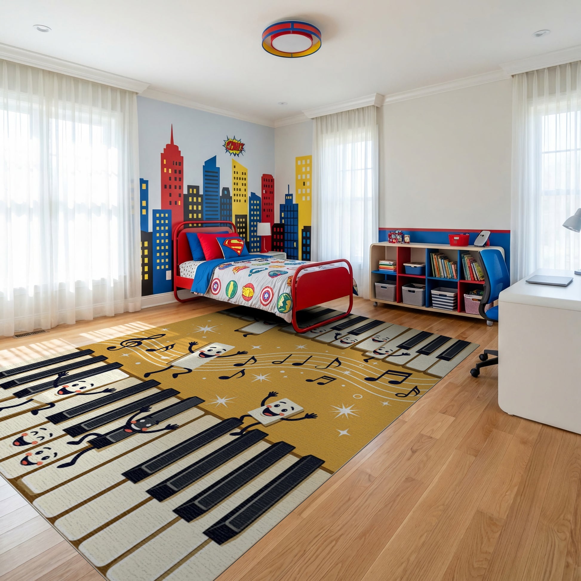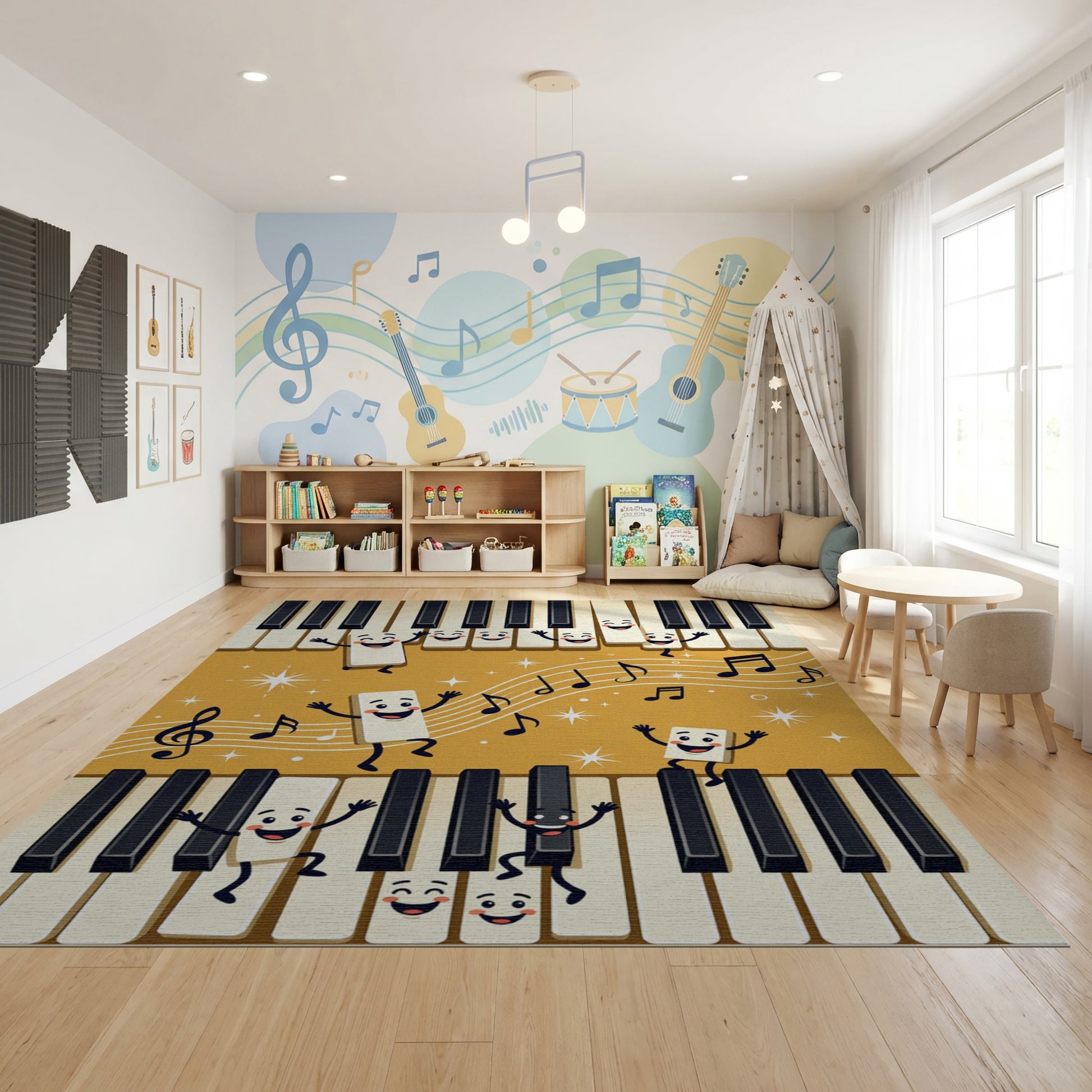 Flatwoven High Traffic Area Rug, Playful Piano Keys Musical Notes Rug, Non Slip, Stain Resistant, Washable Area Rugs for Study Room, Playroom, Bedroom Overview:
