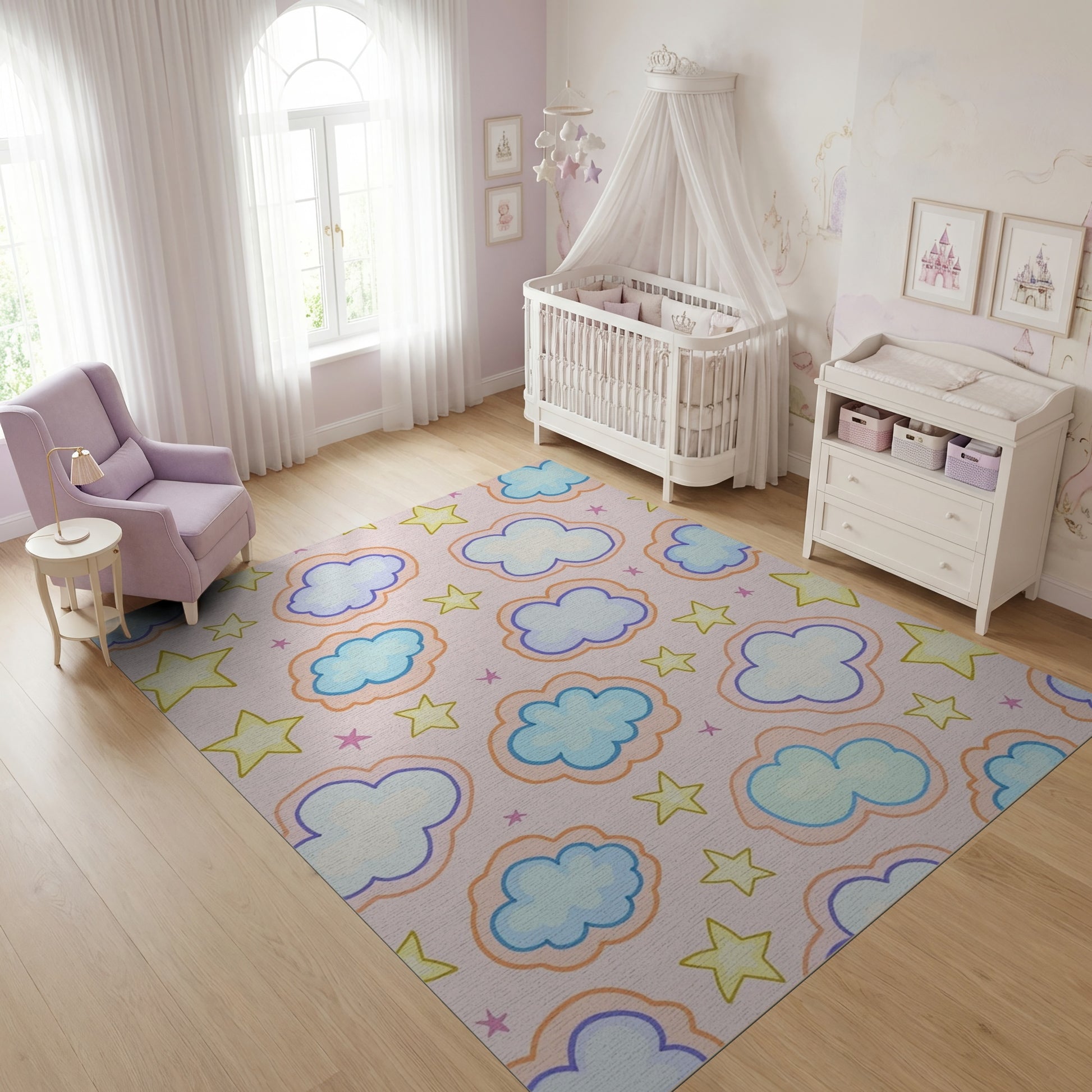 Playful Pink Clouds and Stars Rug