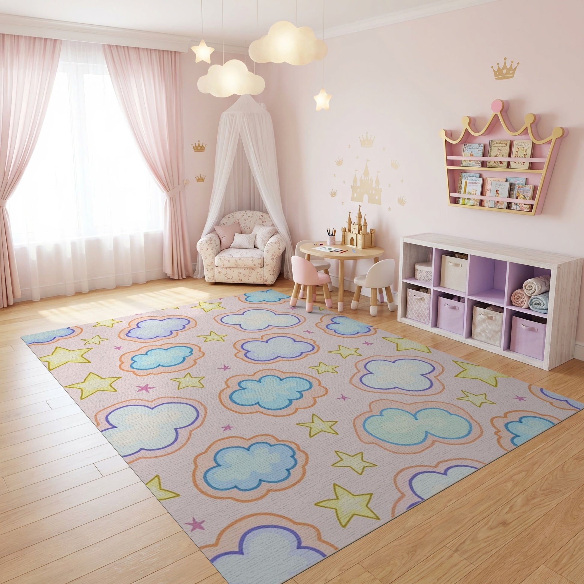 Flatwoven High Traffic Area Rug, Playful Pink Clouds and Stars Rug, Non Slip, Stain Resistant, Washable Area Rugs for Study Room, Playroom, Bedroom Overview: