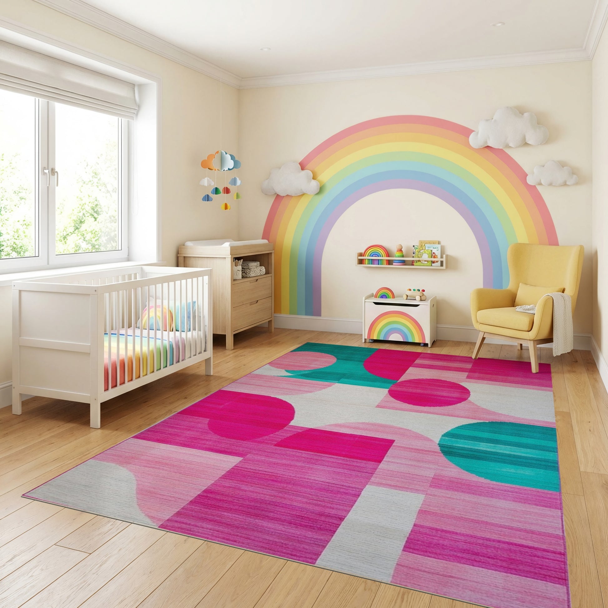 Flatwoven High Traffic Area Rug, Playful Teal Pink Overlapping Circles Rug, Non Slip, Stain Resistant, Washable Area Rugs for Study Room, Playroom, Bedroom Overview: