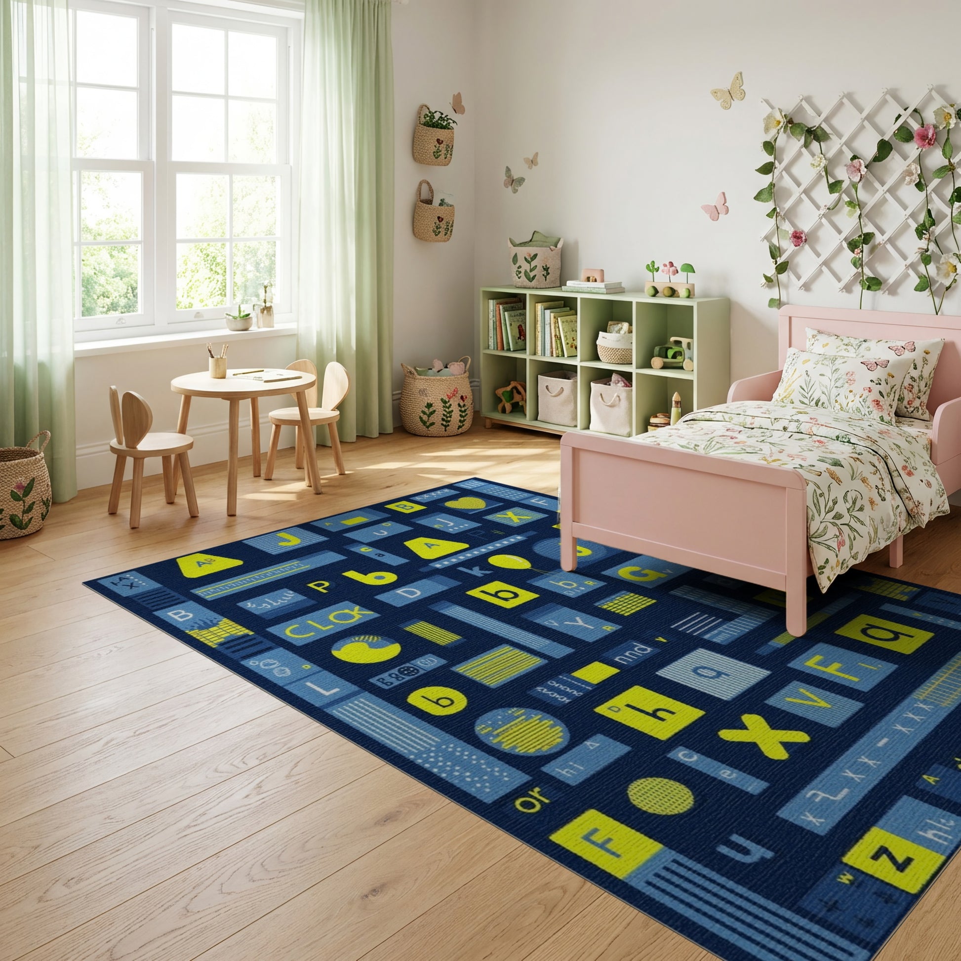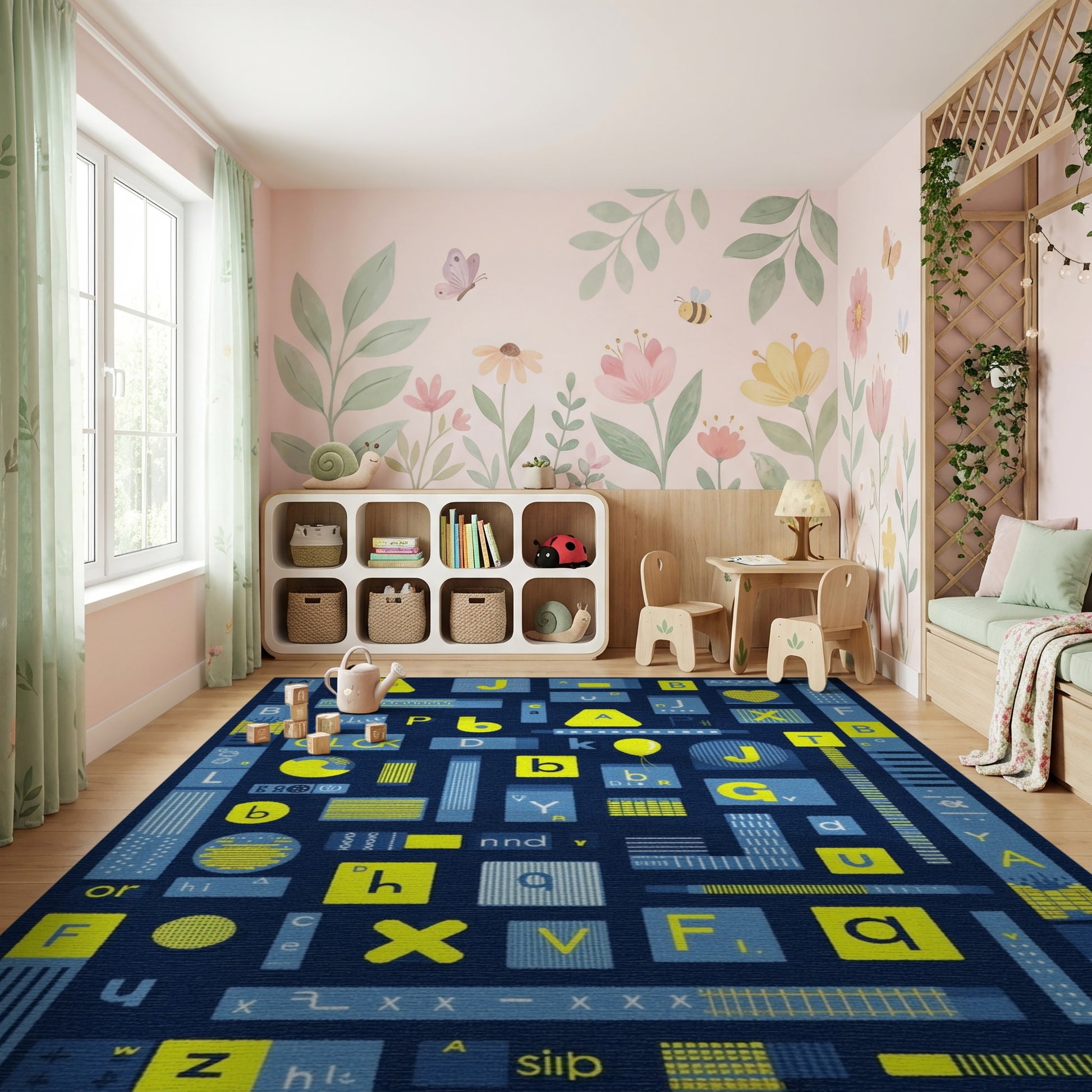 Flatwoven High Traffic Area Rug, Playful Yellow Blue Alphabet Collage Rug, Non Slip, Stain Resistant, Washable Area Rugs for Study Room, Playroom, Bedroom Overview: