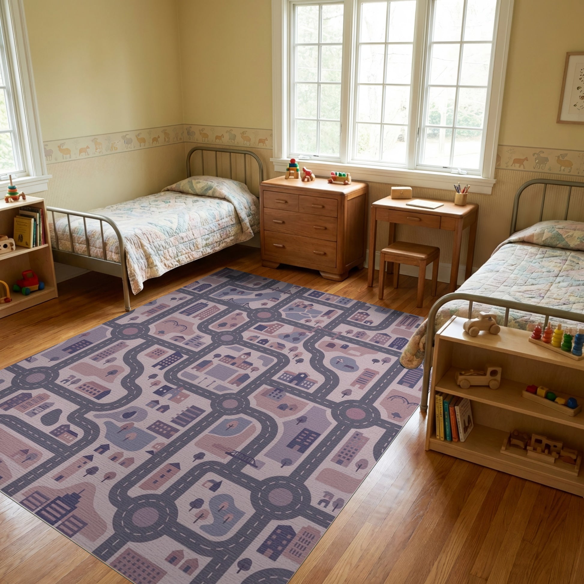 Flatwoven High Traffic Area Rug, Purple City Street Grid Rug, Non Slip, Stain Resistant, Washable Area Rugs for Study Room, Playroom, Bedroom Overview: