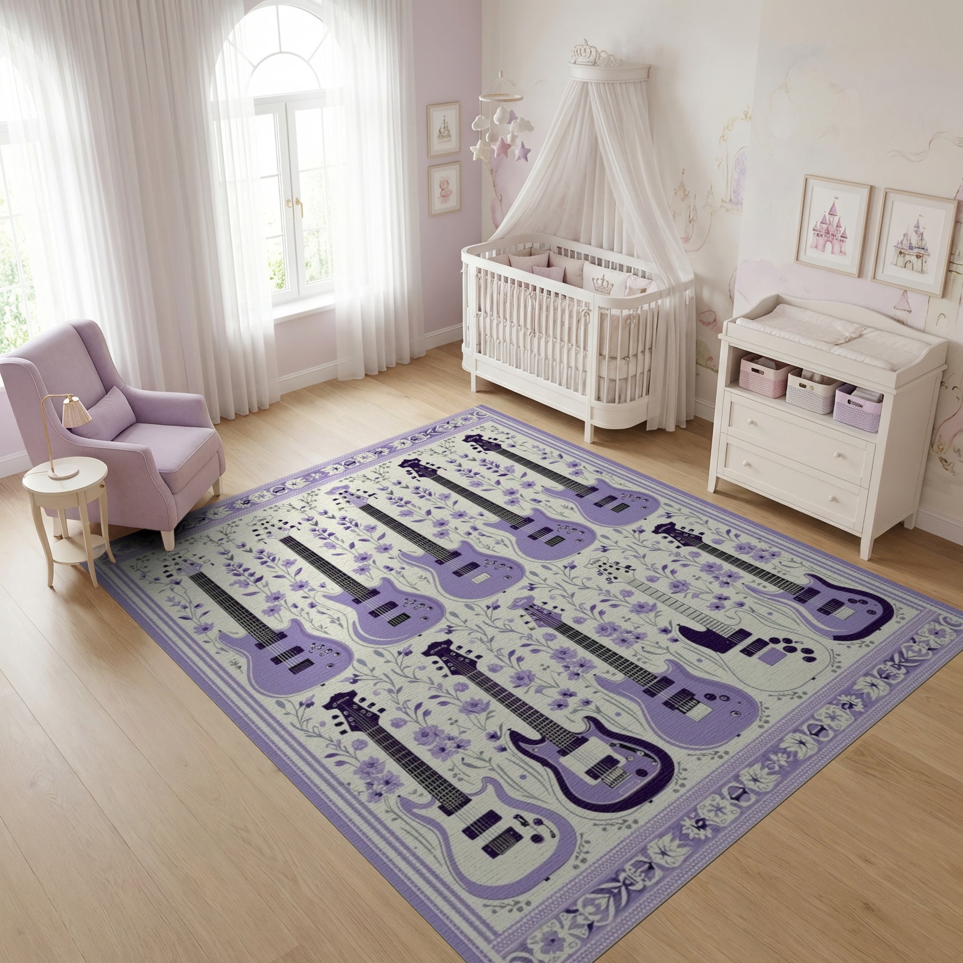 Flatwoven High Traffic Area Rug, Purple Electric Guitars Floral Rug, Non Slip, Stain Resistant, Washable Area Rugs for Study Room, Playroom, Bedroom Overview: