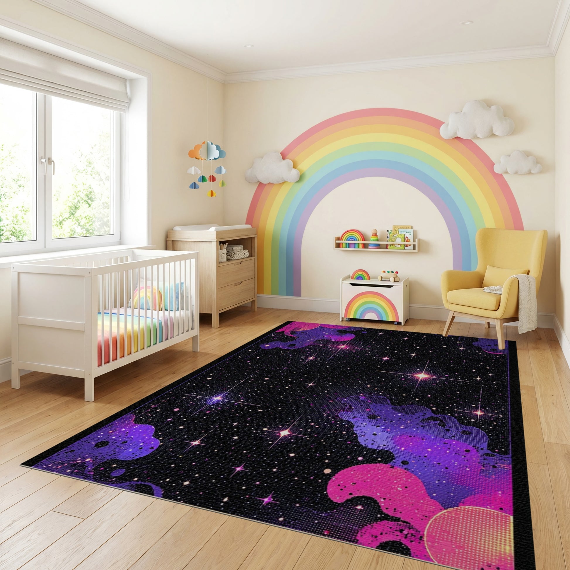 Flatwoven High Traffic Area Rug, Purple Pink Nebula Starry Cosmic Rug, Non Slip, Stain Resistant, Washable Area Rugs for Study Room, Playroom, Bedroom Overview: