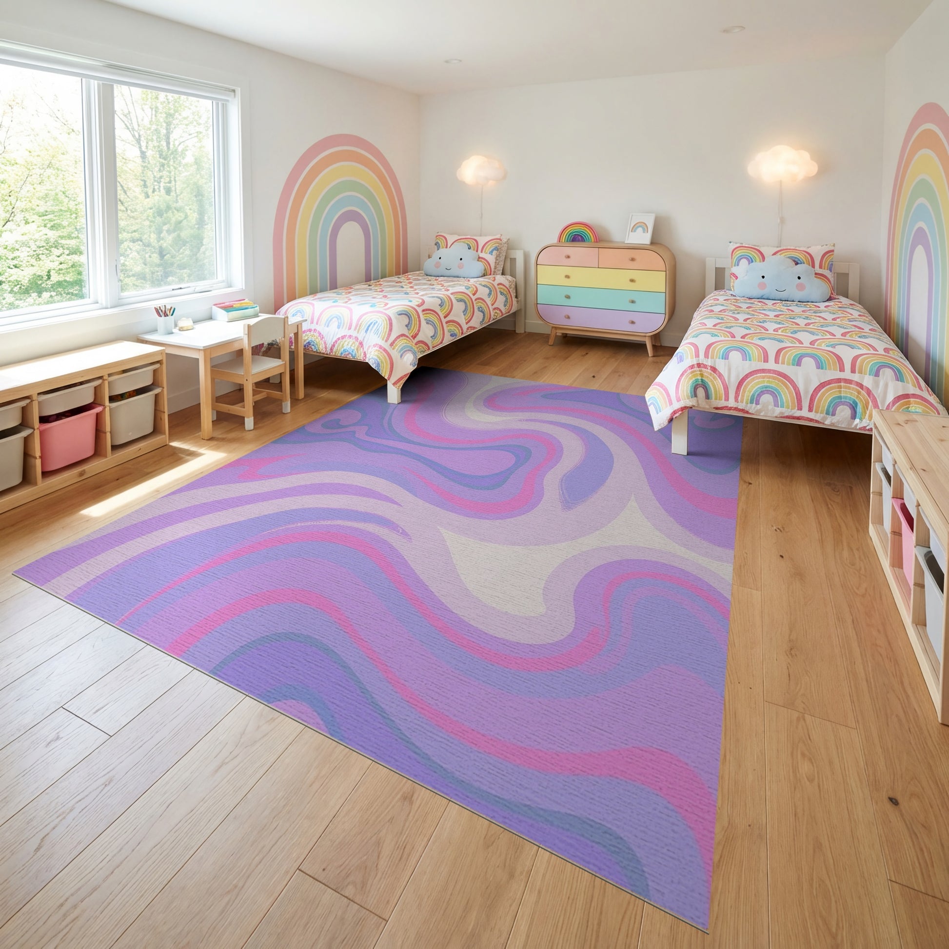 Flatwoven High Traffic Area Rug, Purple Pink Wavy Swirls Abstract Rug, Non Slip, Stain Resistant, Washable Area Rugs for Study Room, Playroom, Bedroom Overview: