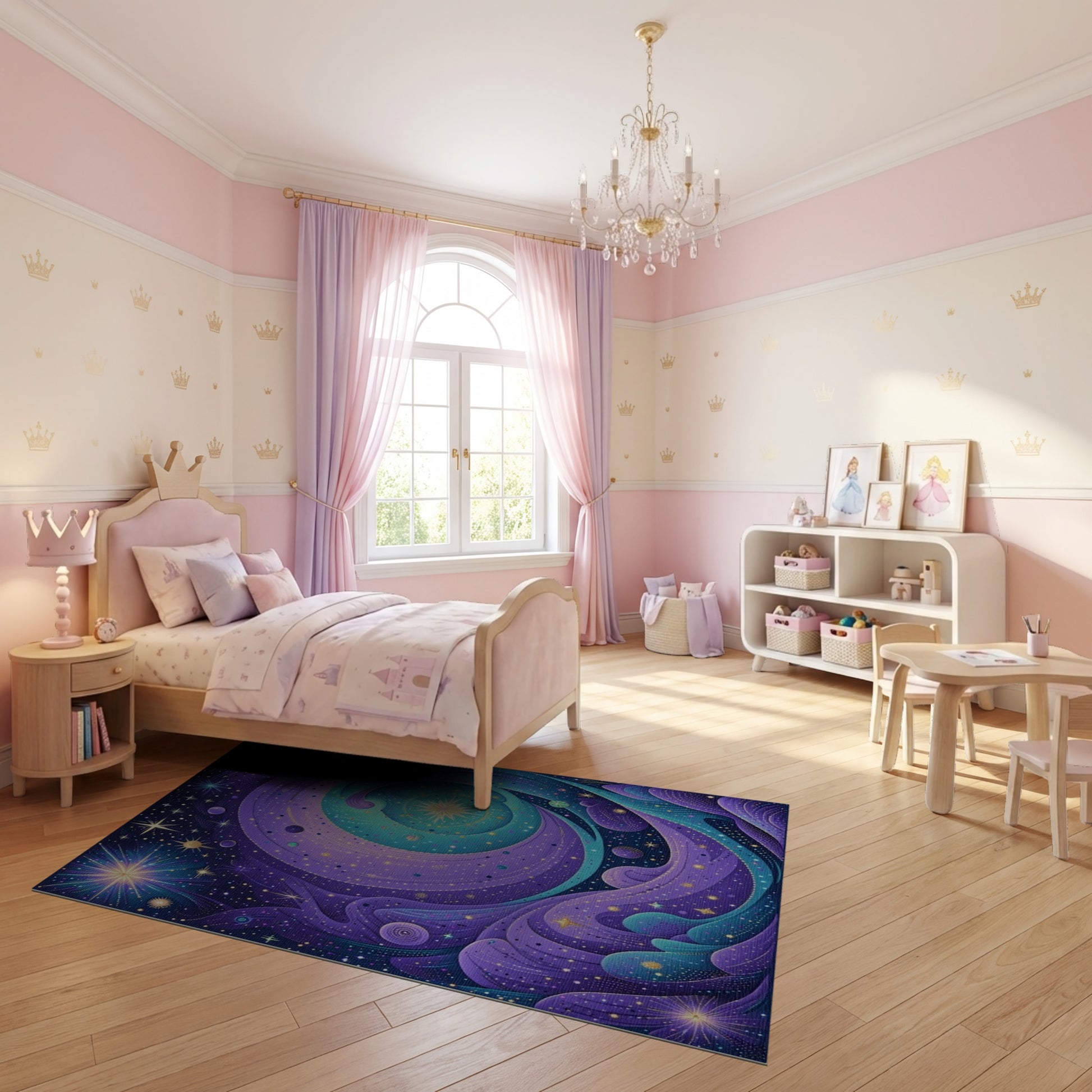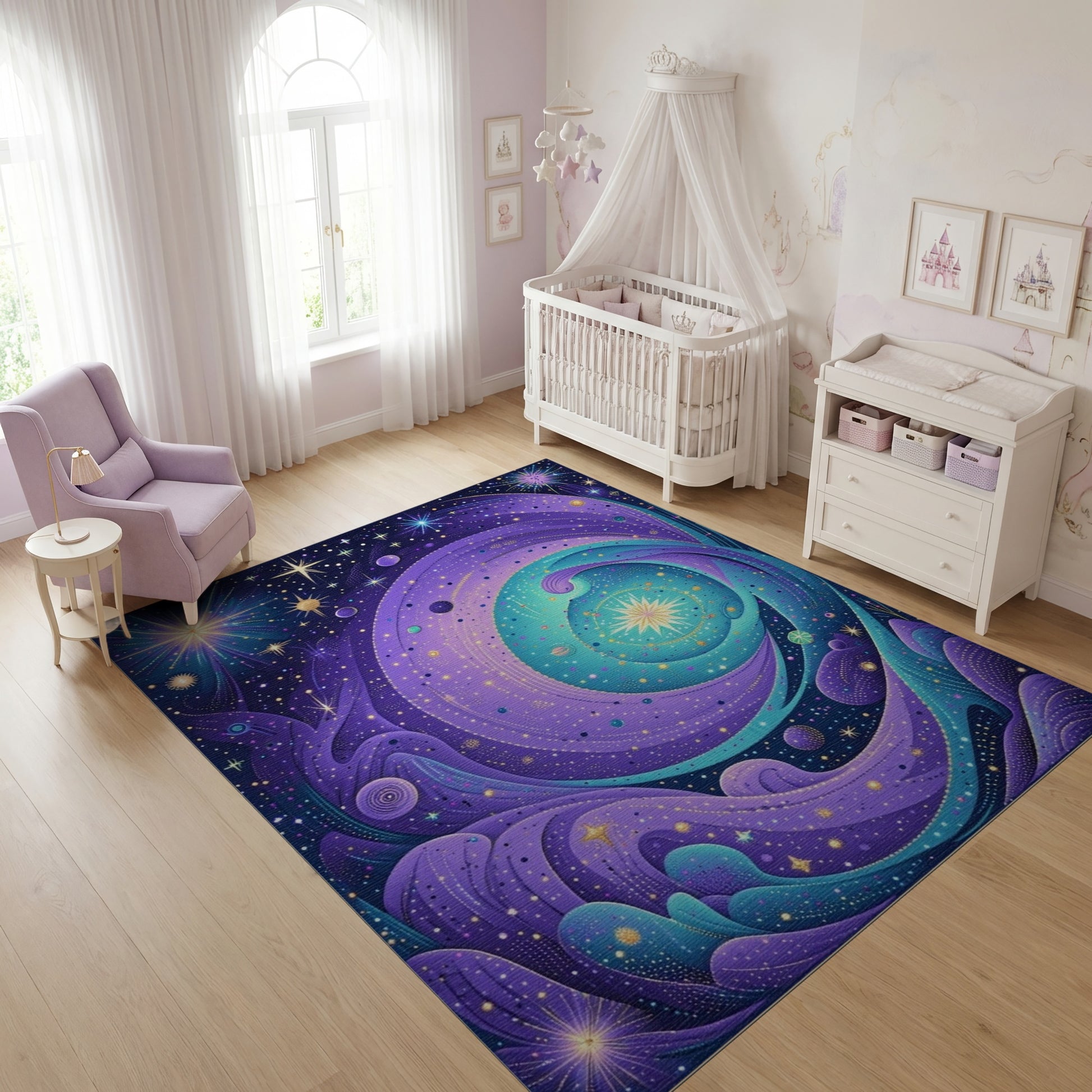 Flatwoven High Traffic Area Rug, Purple Teal Cosmic Swirl Stars Rug, Non Slip, Stain Resistant, Washable Area Rugs for Study Room, Playroom, Bedroom Overview: