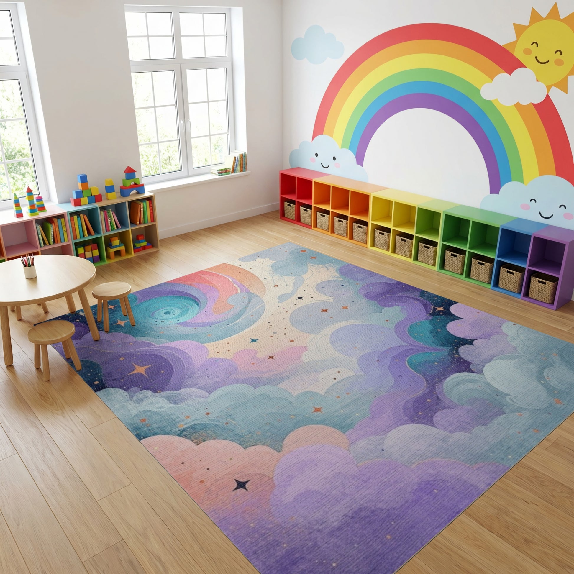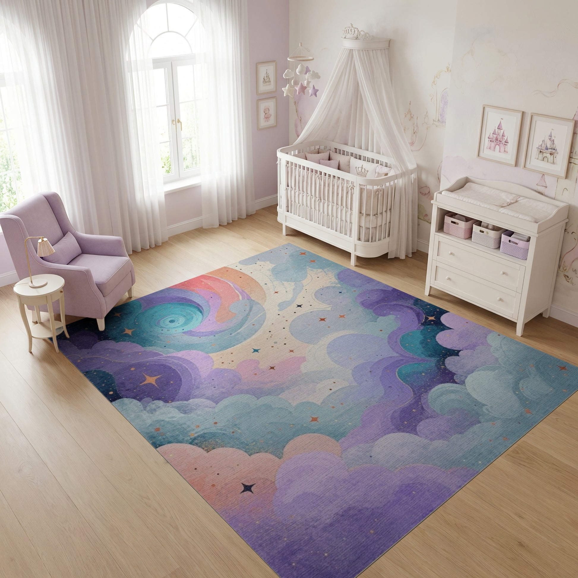 Flatwoven High Traffic Area Rug, Purple Teal Swirling Stars Clouds Rug, Non Slip, Stain Resistant, Washable Area Rugs for Study Room, Playroom, Bedroom Overview: