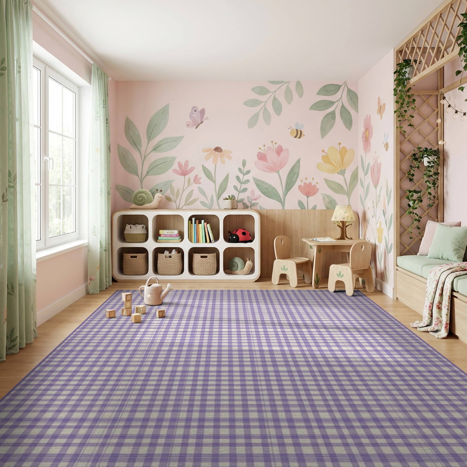 Flatwoven High Traffic Area Rug, Purple White Gingham Check Rug, Non Slip, Stain Resistant, Washable Area Rugs for Study Room, Playroom, Bedroom Overview: