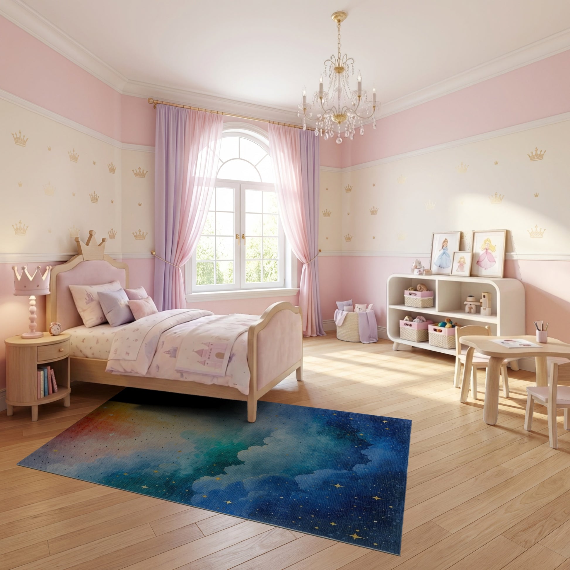 Flatwoven High Traffic Area Rug, Radiant Blue Orange Starry Clouds Rug, Non Slip, Stain Resistant, Washable Area Rugs for Study Room, Playroom, Bedroom Overview: