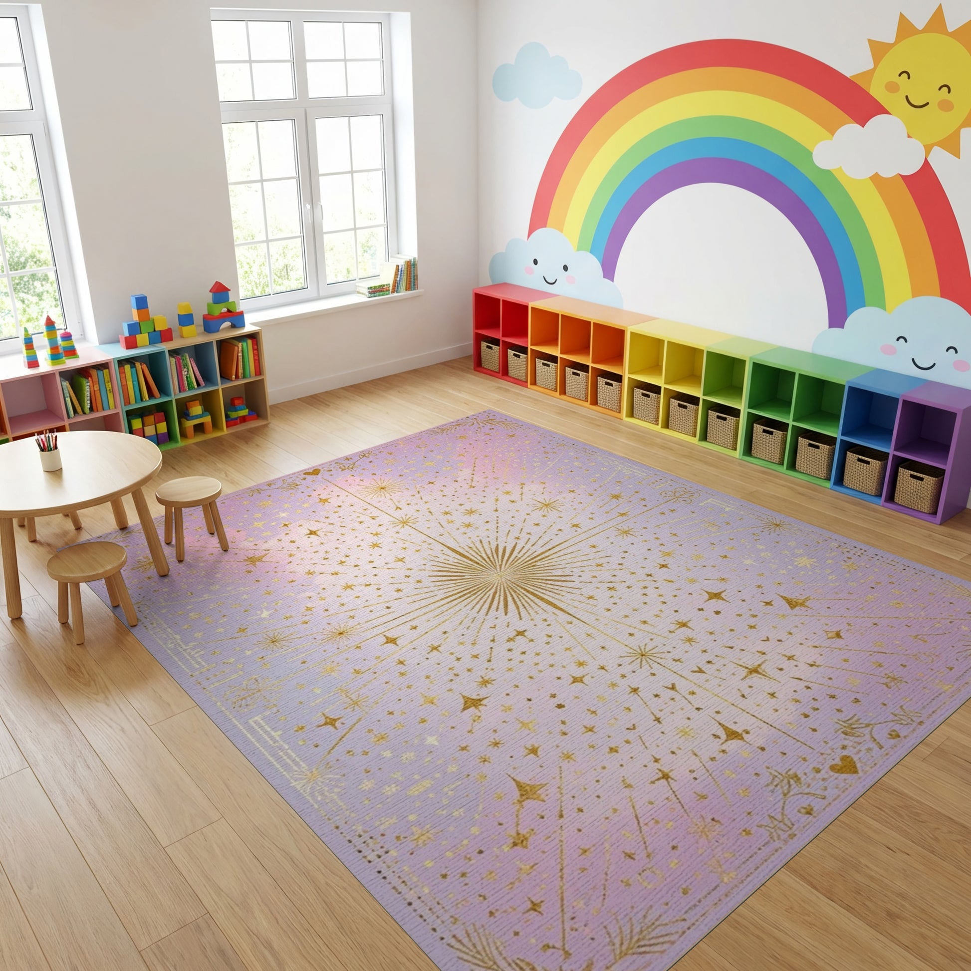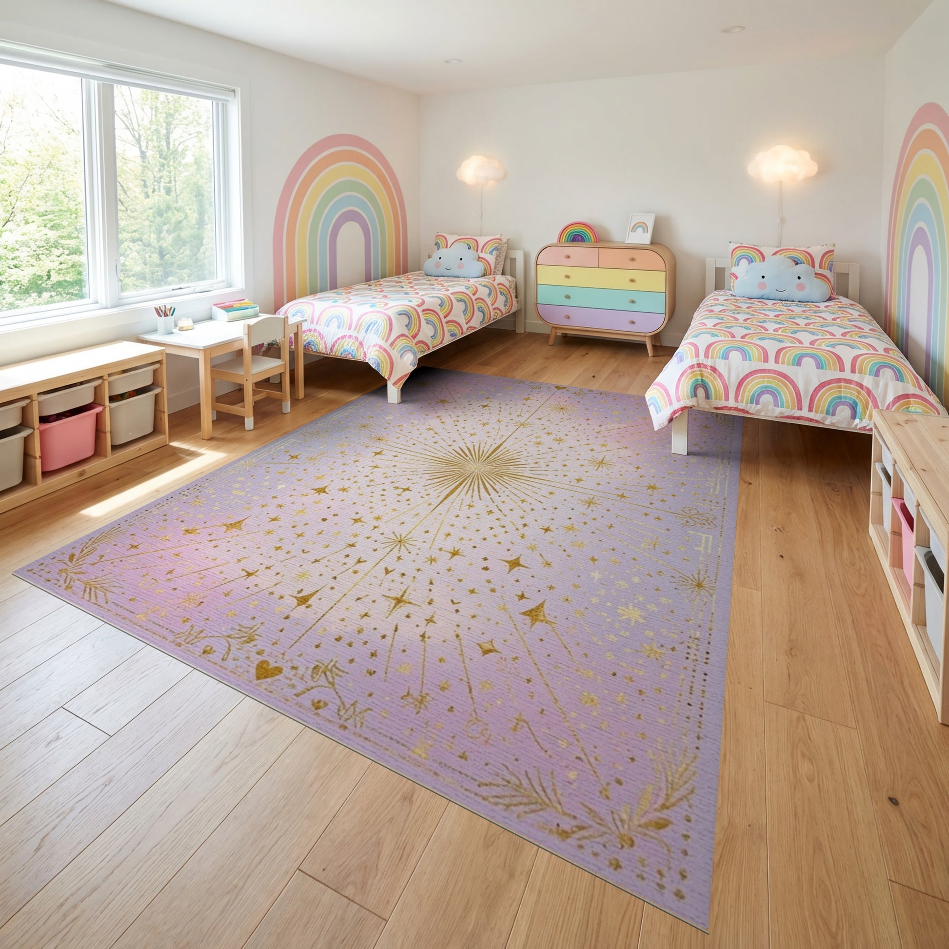 Flatwoven High Traffic Area Rug, Radiant Golden Starburst Starry Purple Rug, Non Slip, Stain Resistant, Washable Area Rugs for Study Room, Playroom, Bedroom Overview: