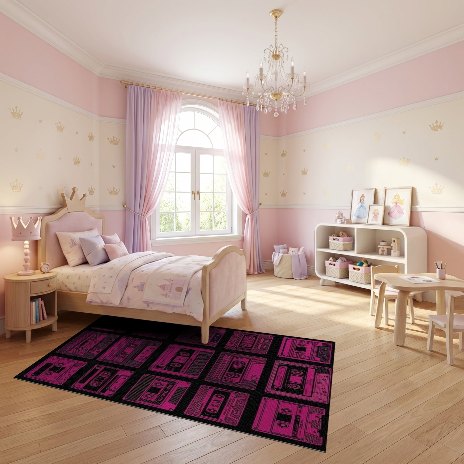 Flatwoven High Traffic Area Rug, Retro Neon Pink Cassette Tapes Rug, Non Slip, Stain Resistant, Washable Area Rugs for Study Room, Playroom, Bedroom Overview: