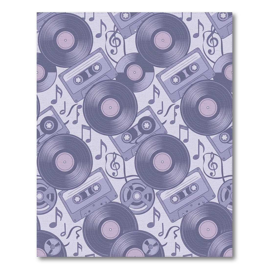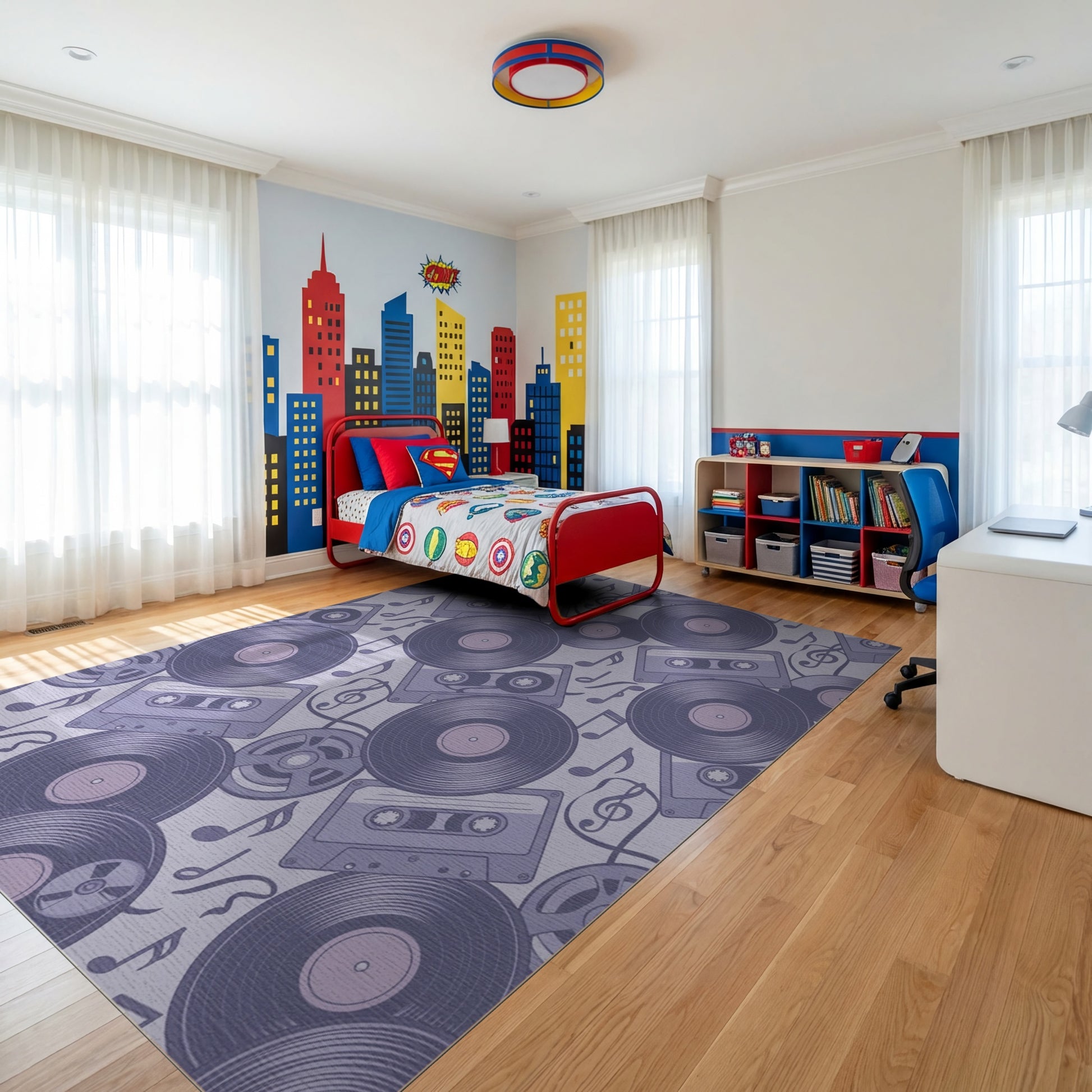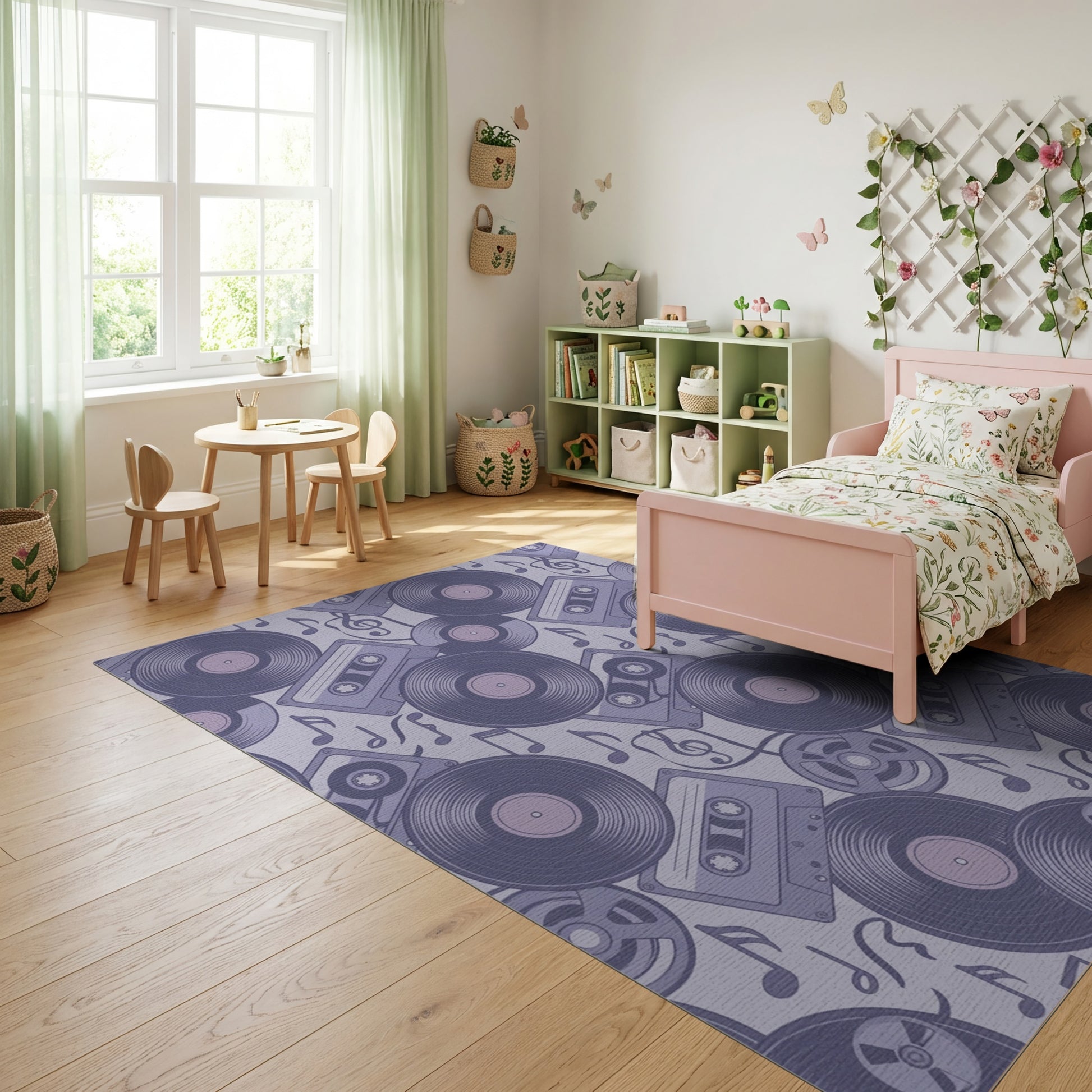 Flatwoven High Traffic Area Rug, Retro Purple Vinyl Records Cassettes Rug, Non Slip, Stain Resistant, Washable Area Rugs for Study Room, Playroom, Bedroom Overview: