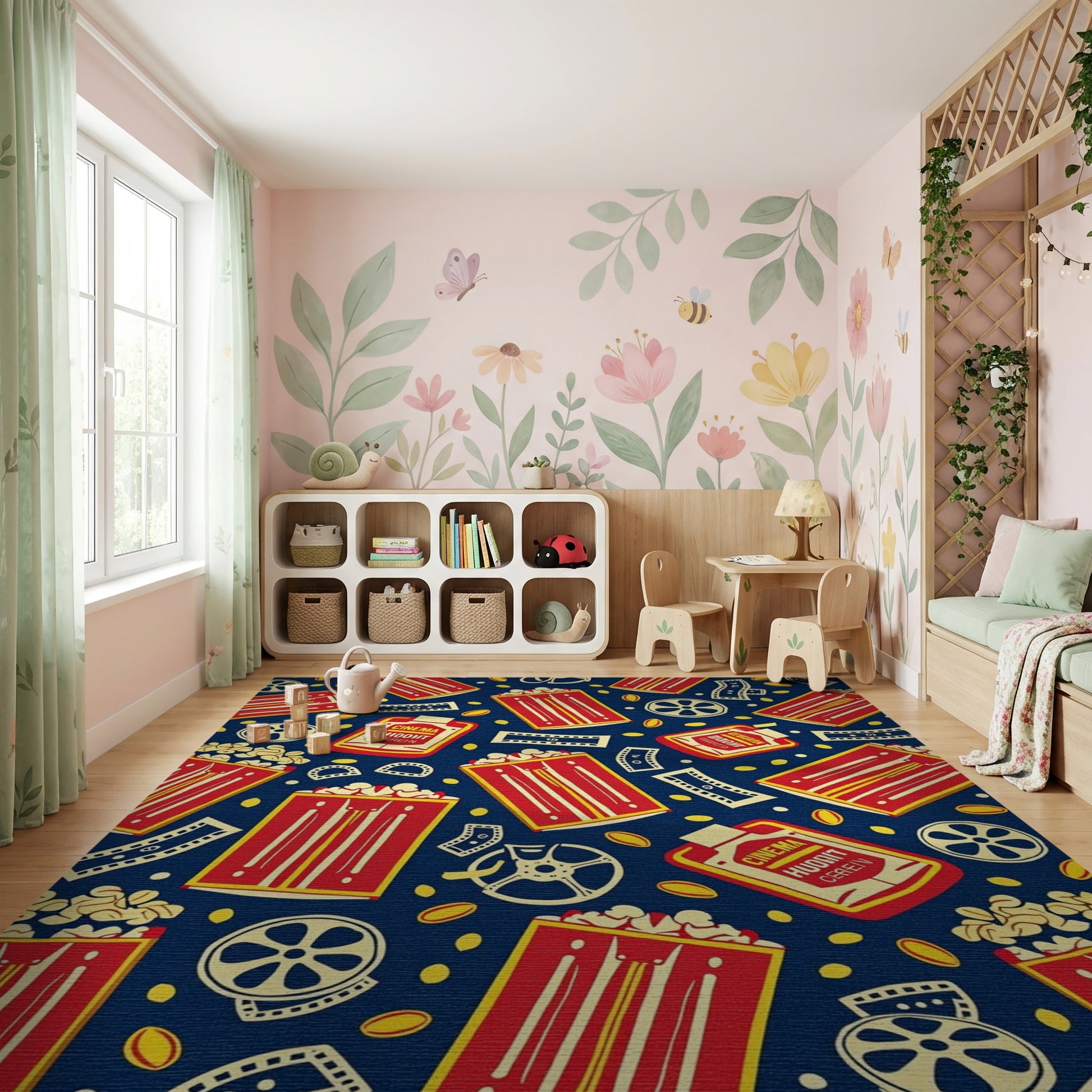 Flatwoven High Traffic Area Rug, Retro Red Popcorn Film Reels Rug, Non Slip, Stain Resistant, Washable Area Rugs for Study Room, Playroom, Bedroom Overview: