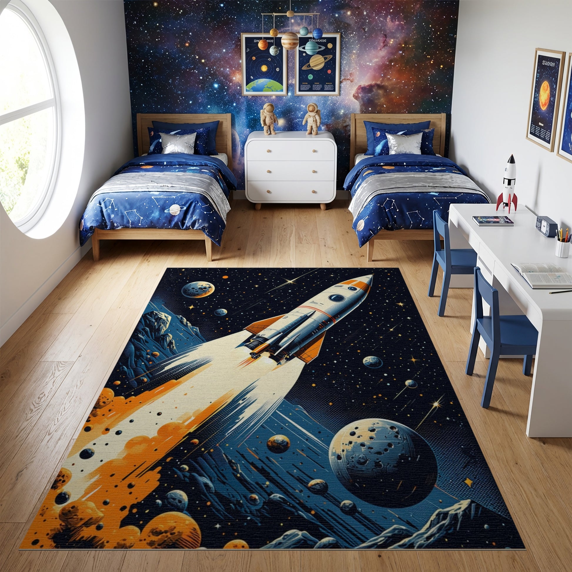 Flatwoven High Traffic Area Rug, Retro Rocket Launch Cosmic Stars Rug, Non Slip, Stain Resistant, Washable Area Rugs for Study Room, Playroom, Bedroom Overview: