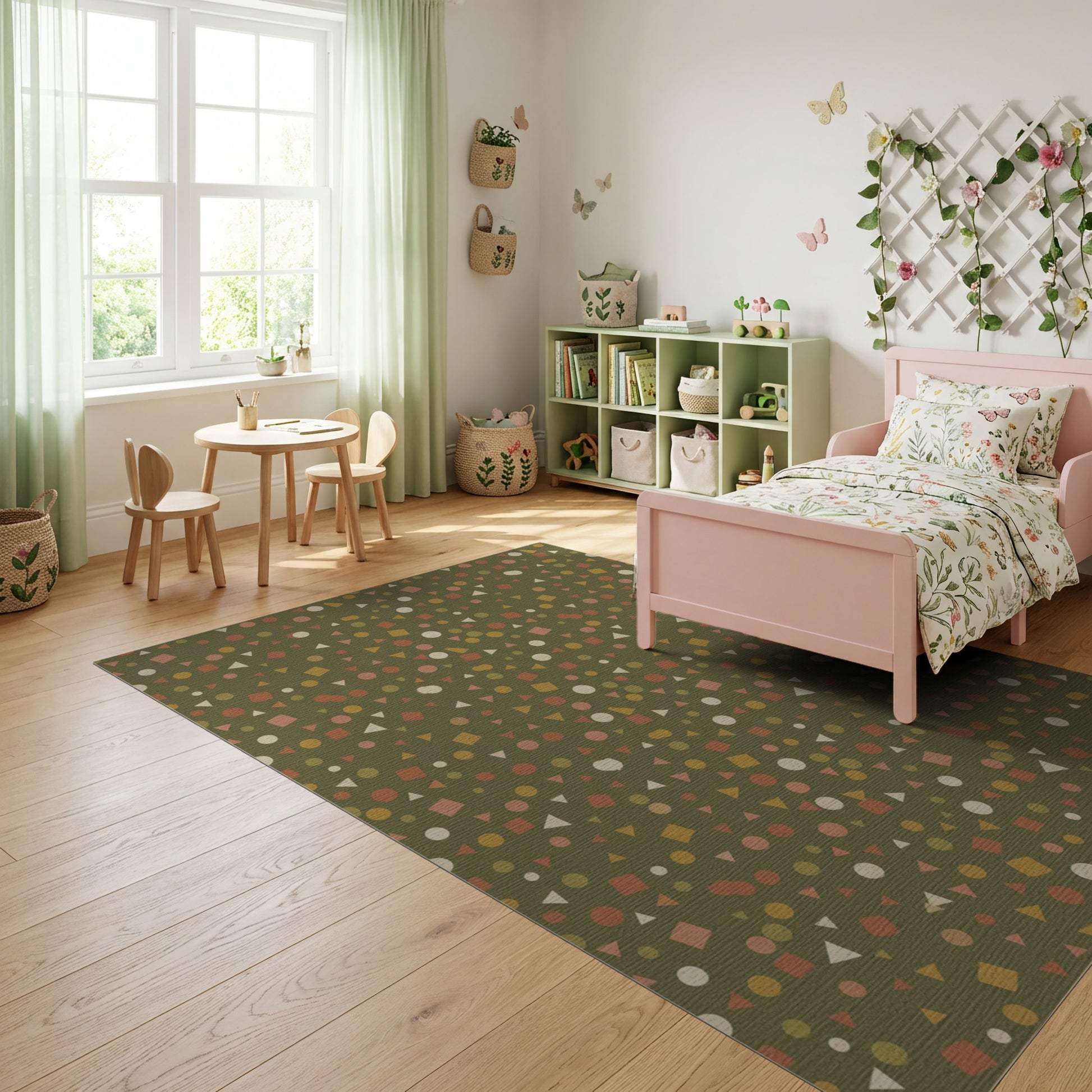 Flatwoven High Traffic Area Rug, Scattered Earthy Geometric Shapes Rug, Non Slip, Stain Resistant, Washable Area Rugs for Study Room, Playroom, Bedroom Overview: