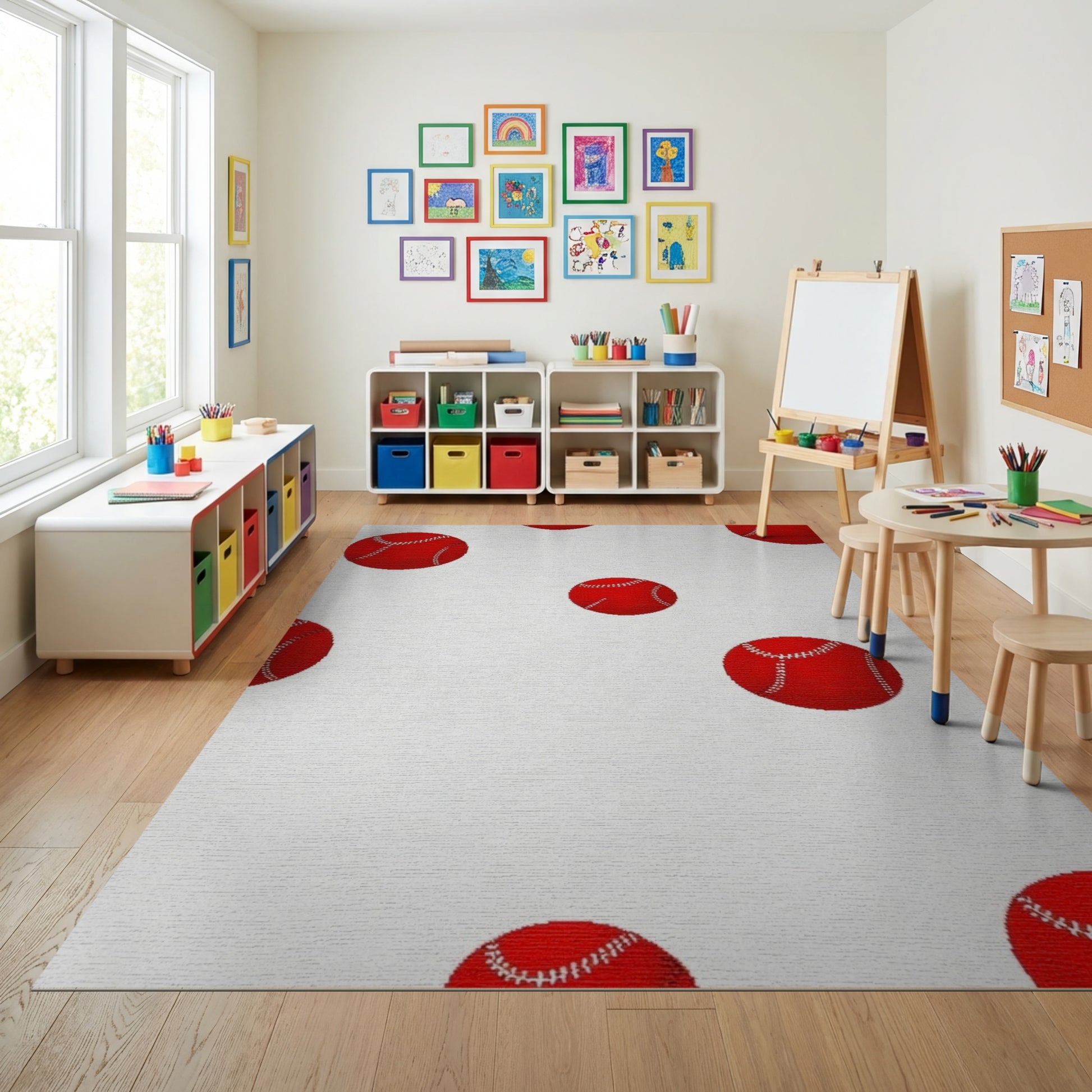 Flatwoven High Traffic Area Rug, Scattered Red Stitched Baseballs Playful Rug, Non Slip, Stain Resistant, Washable Area Rugs for Study Room, Playroom, Bedroom Overview: