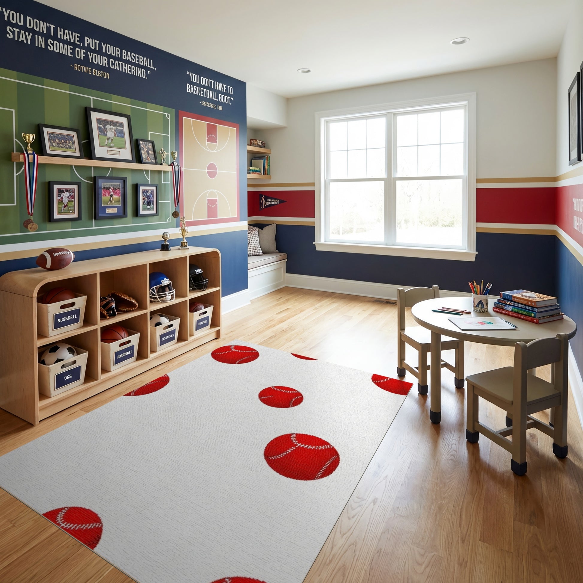 Scattered Red Stitched Baseballs Playful Rug