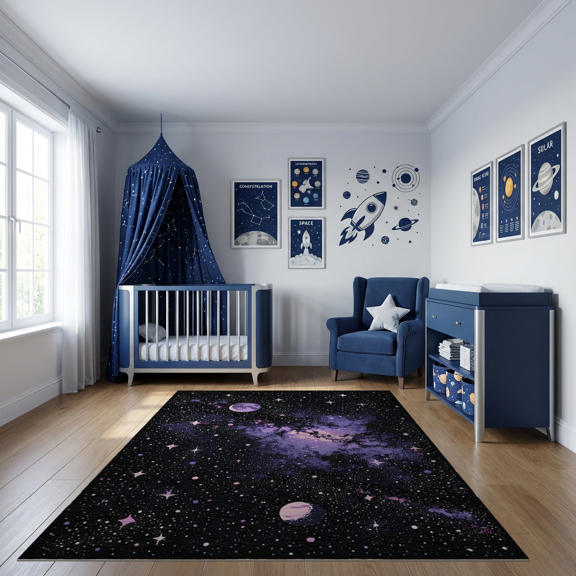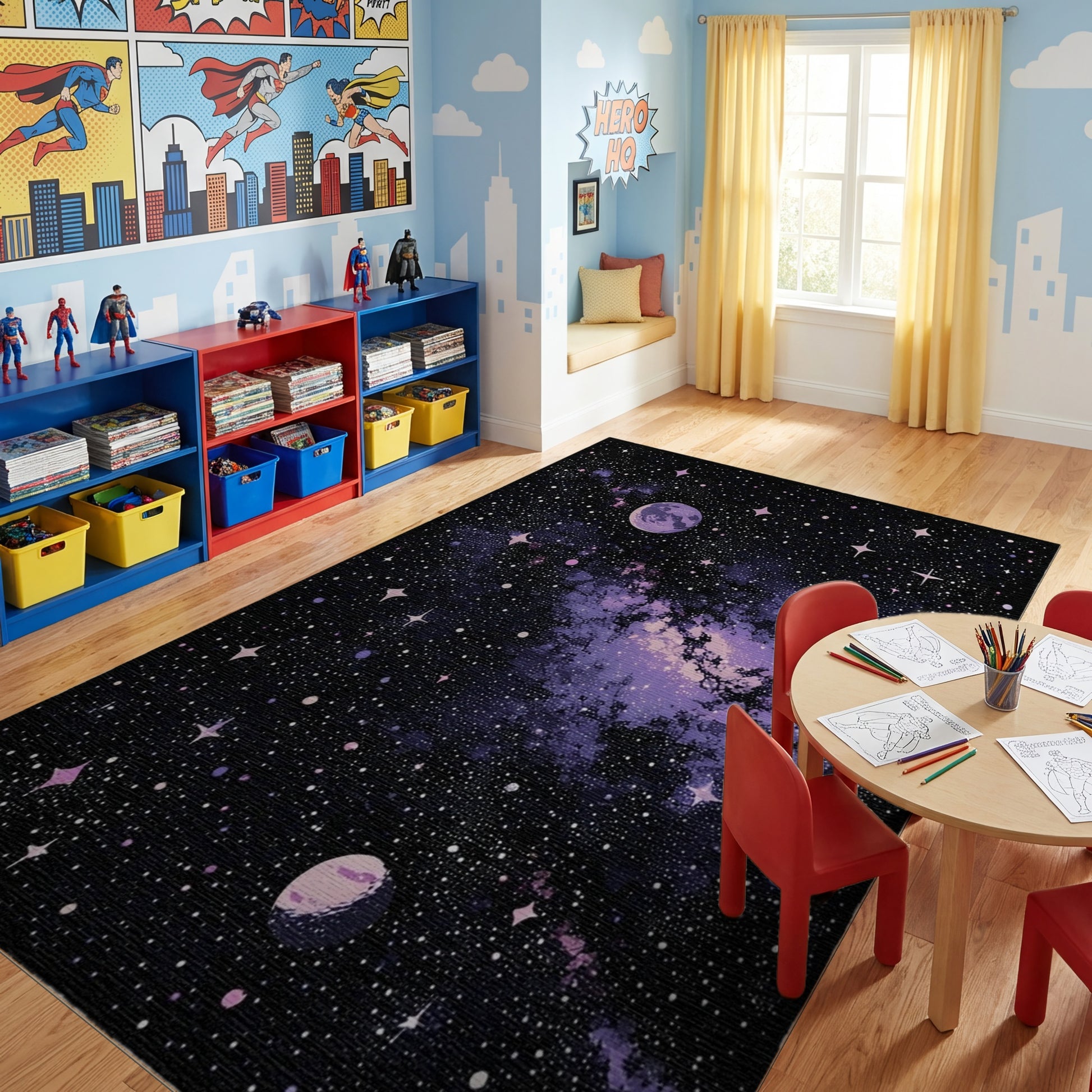 Flatwoven High Traffic Area Rug, Starry Purple Nebula Cosmic Rug, Non Slip, Stain Resistant, Washable Area Rugs for Study Room, Playroom, Bedroom Overview: