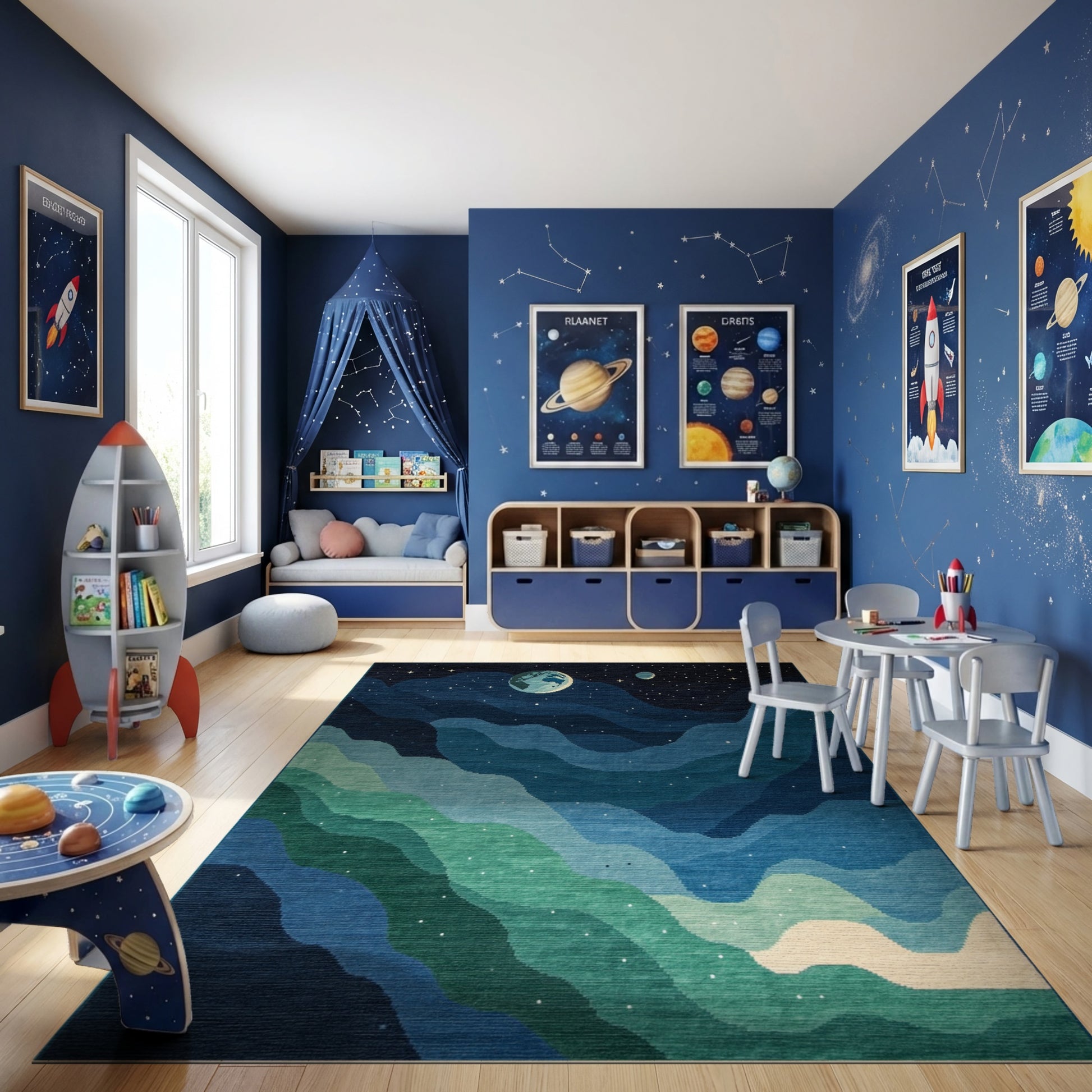 Flatwoven High Traffic Area Rug, Starry Wavy Navy Earth Cosmic Rug, Non Slip, Stain Resistant, Washable Area Rugs for Study Room, Playroom, Bedroom Overview: