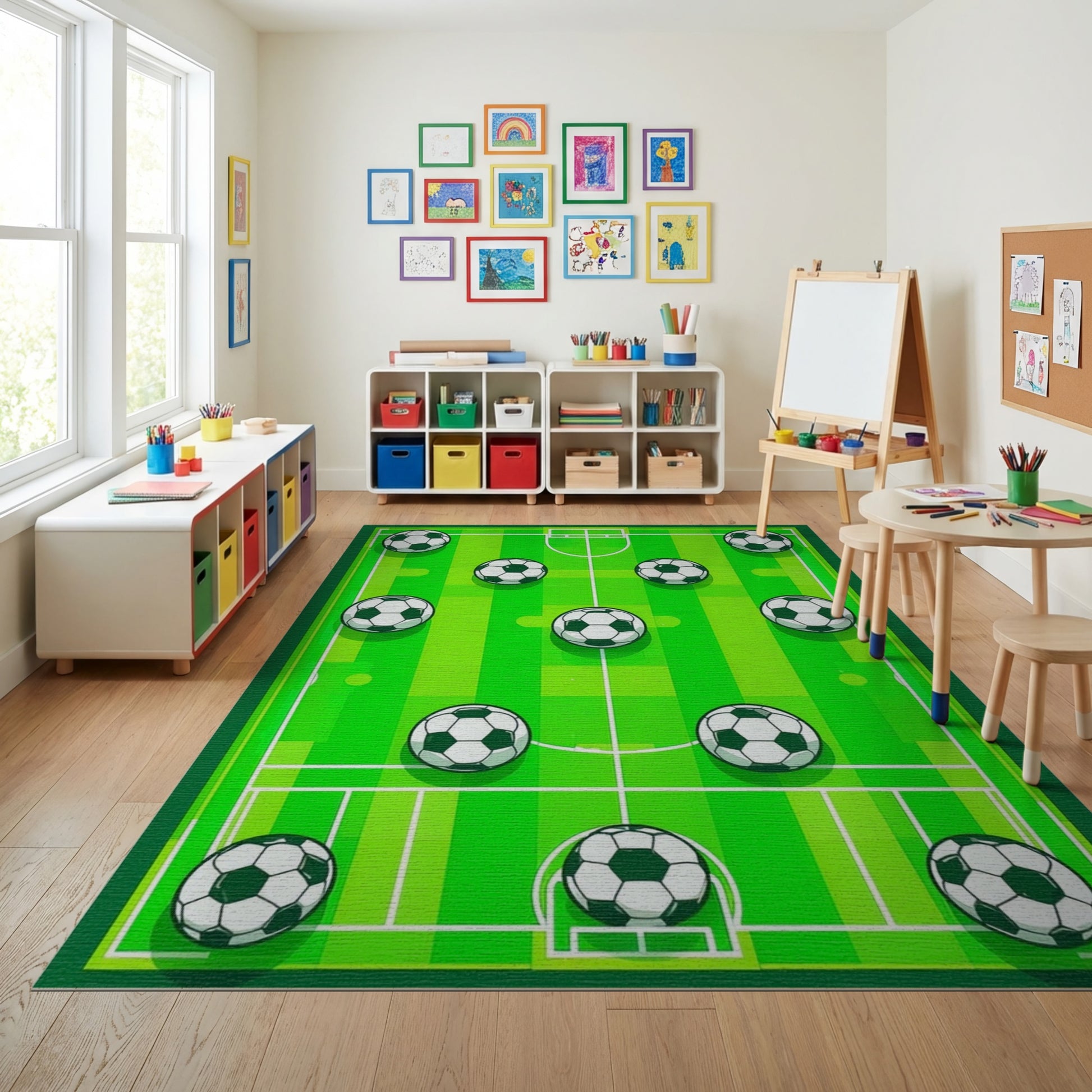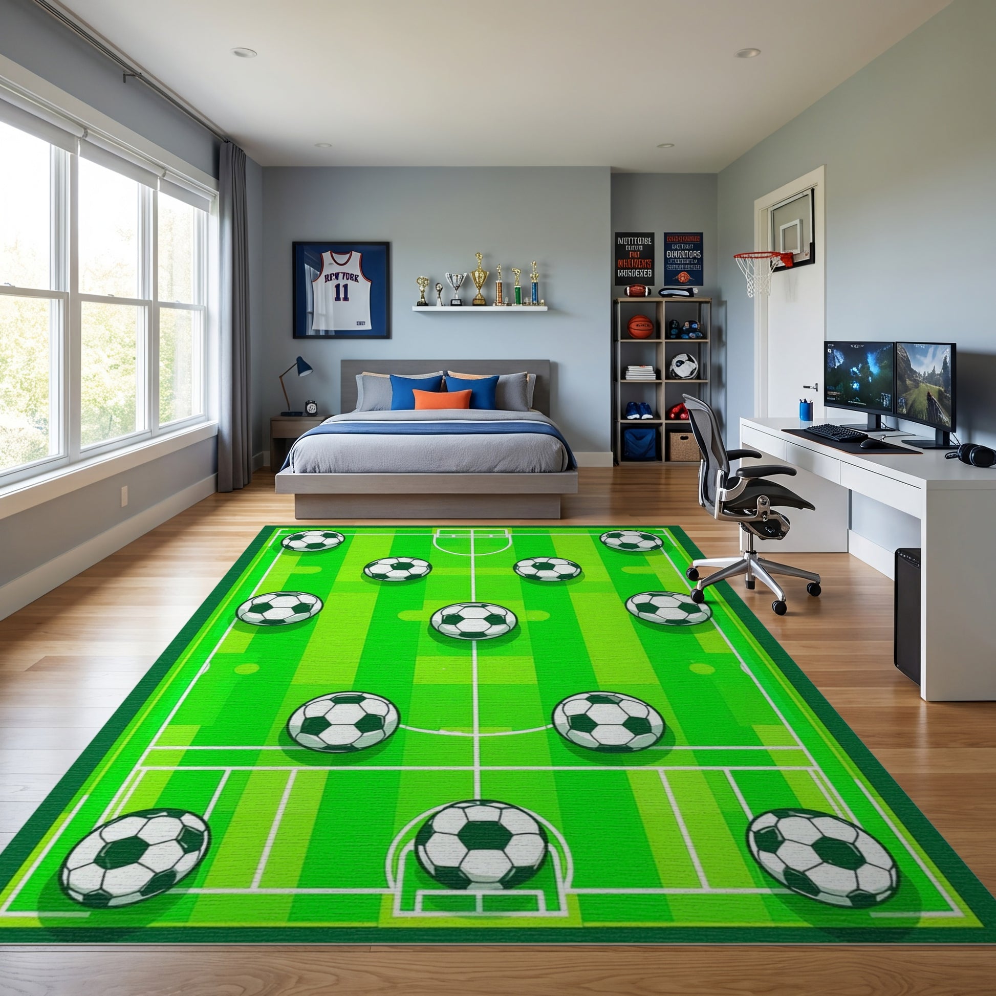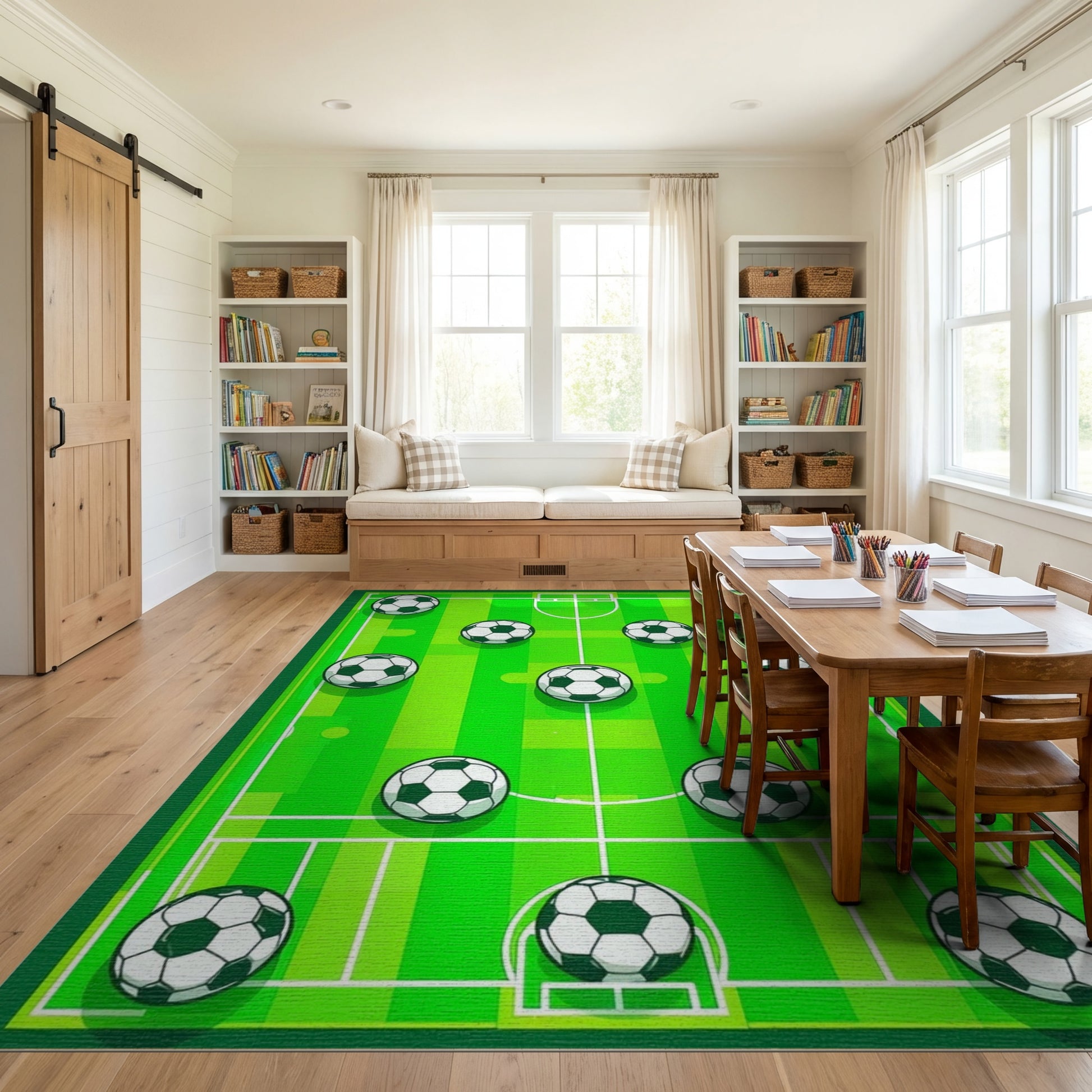 Flatwoven High Traffic Area Rug, Striped Green Soccer Field Balls Rug 2, Non Slip, Stain Resistant, Washable Area Rugs for Study Room, Playroom, Bedroom Overview: