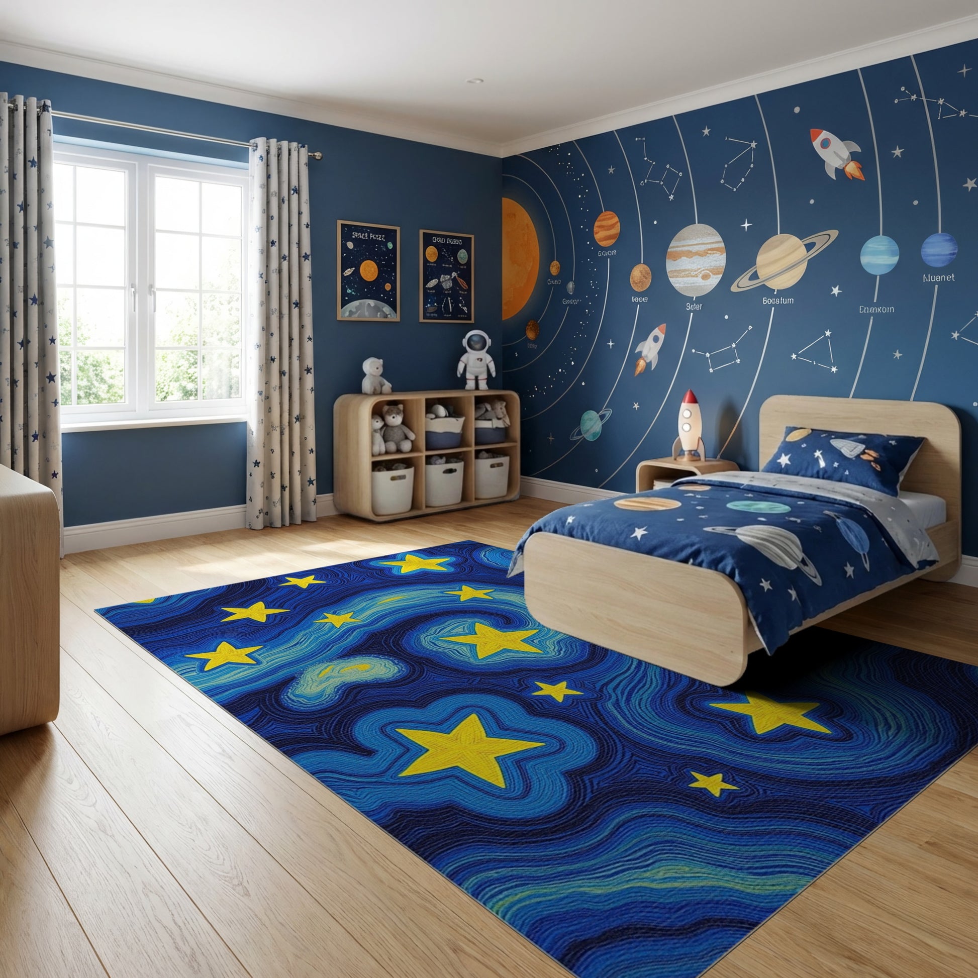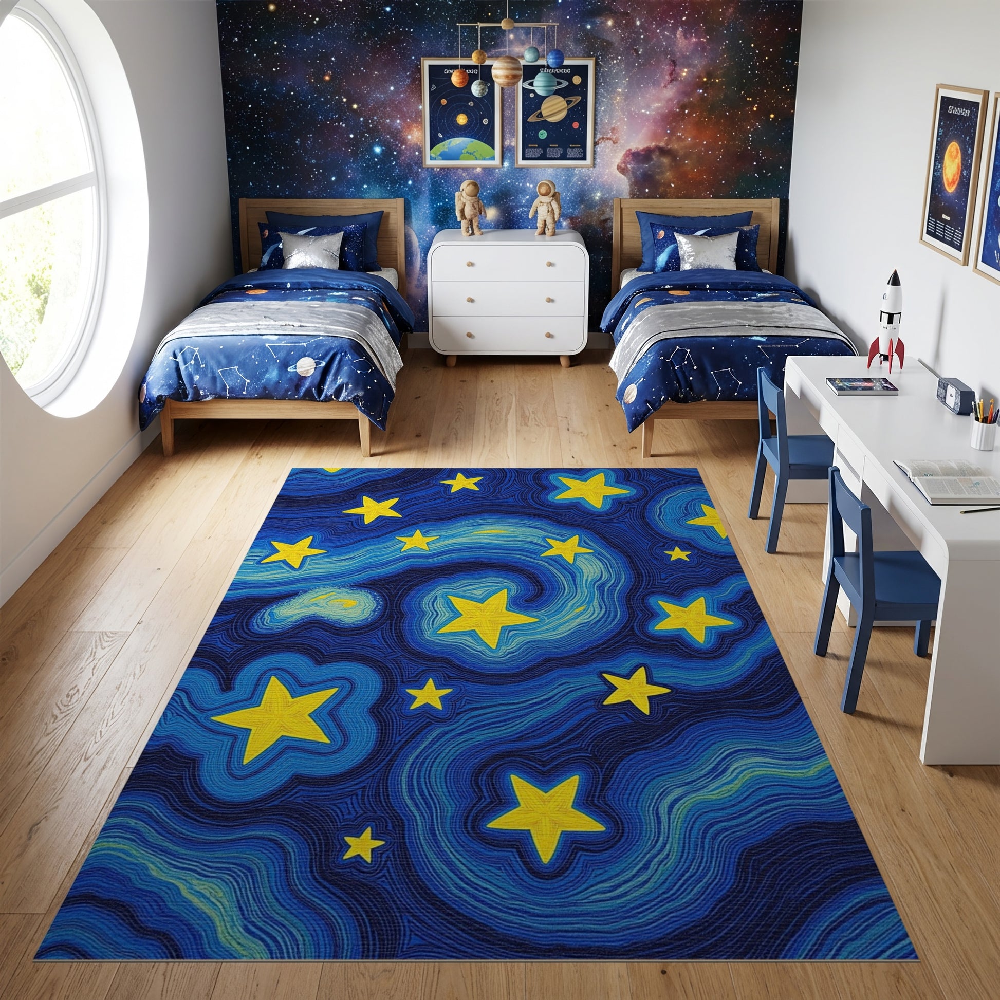 Flatwoven High Traffic Area Rug, Swirling Yellow Stars Deep Blue Rug, Non Slip, Stain Resistant, Washable Area Rugs for Study Room, Playroom, Bedroom Overview: