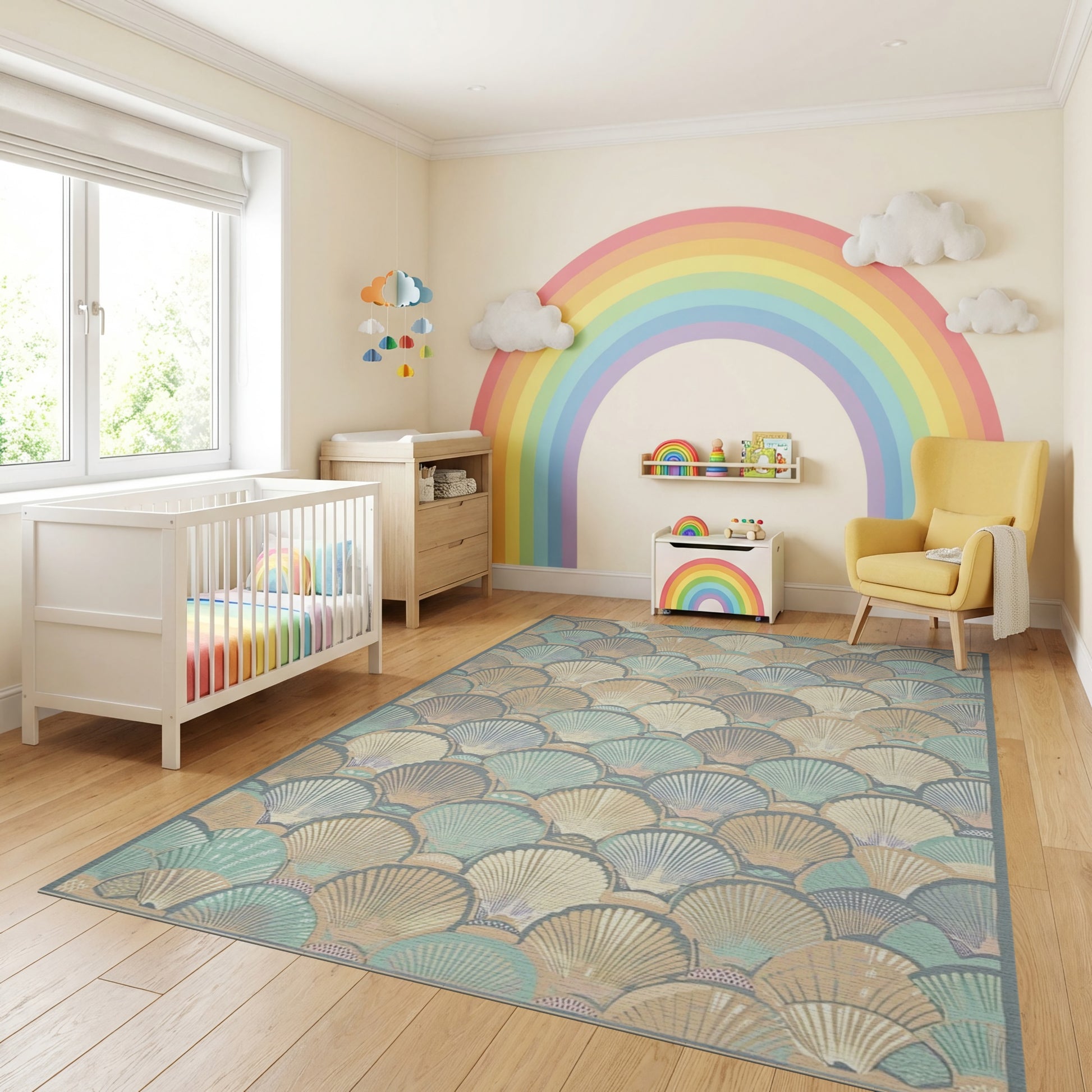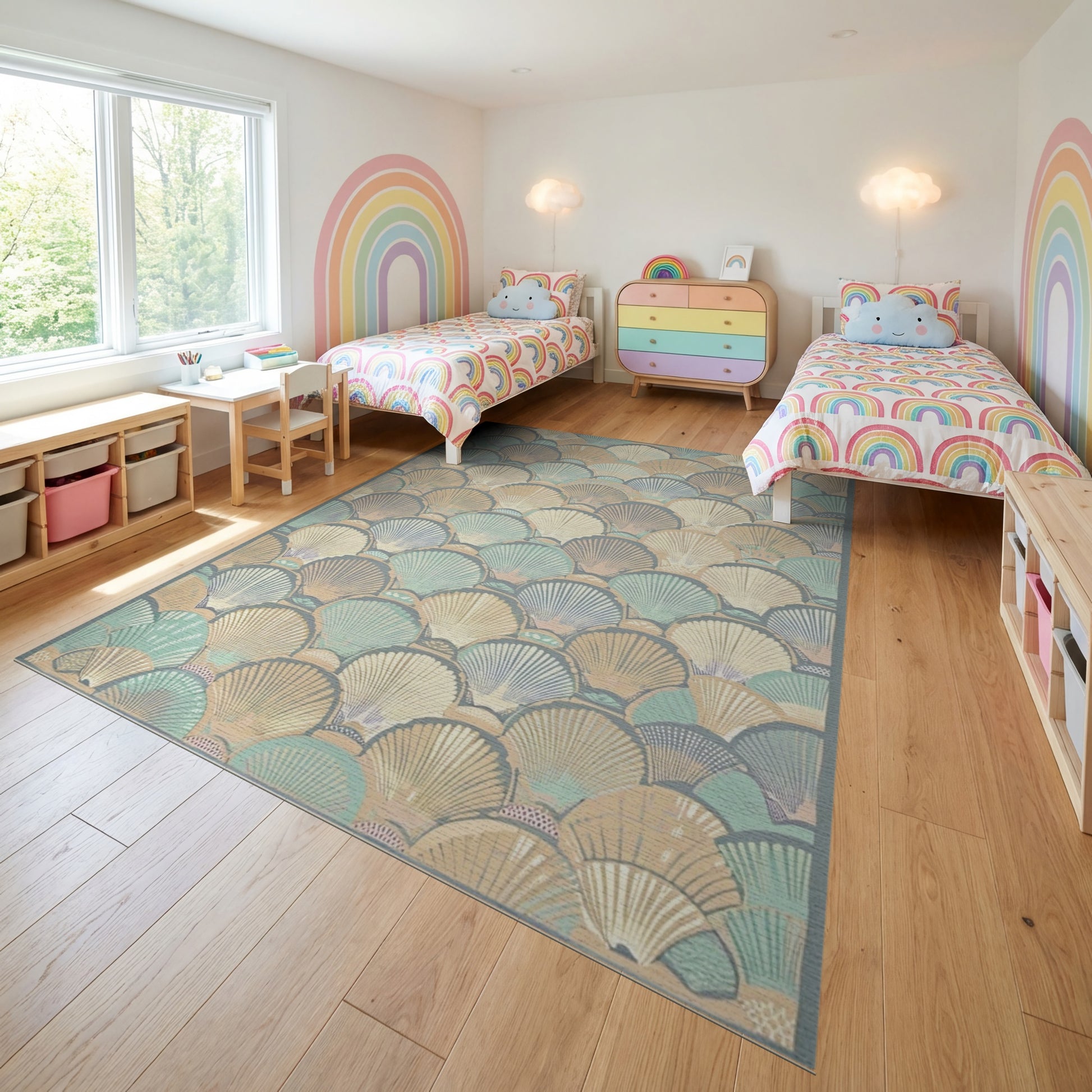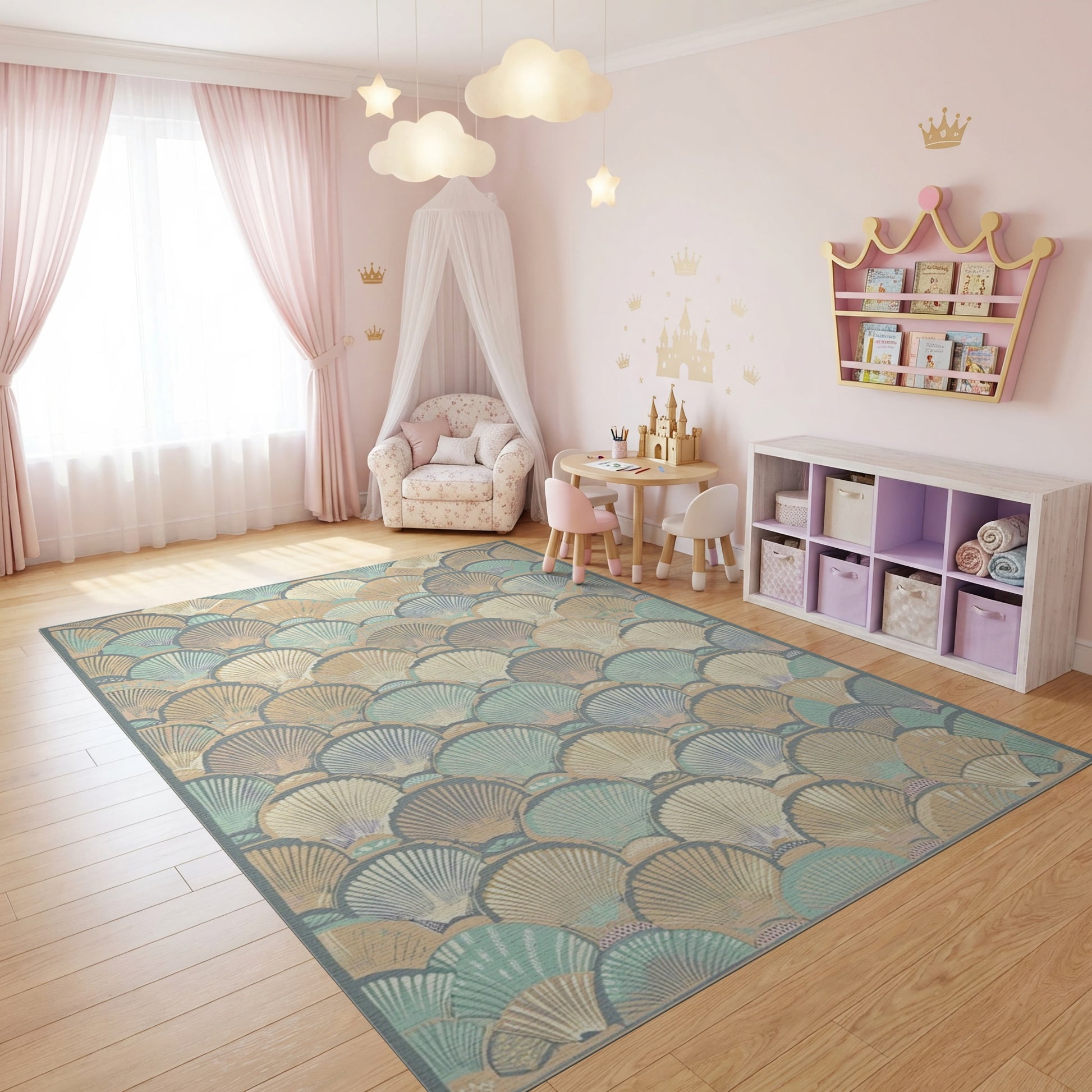 Flatwoven High Traffic Area Rug, Teal Cream Scalloped Seashell Coastal Rug, Non Slip, Stain Resistant, Washable Area Rugs for Study Room, Playroom, Bedroom Overview:
