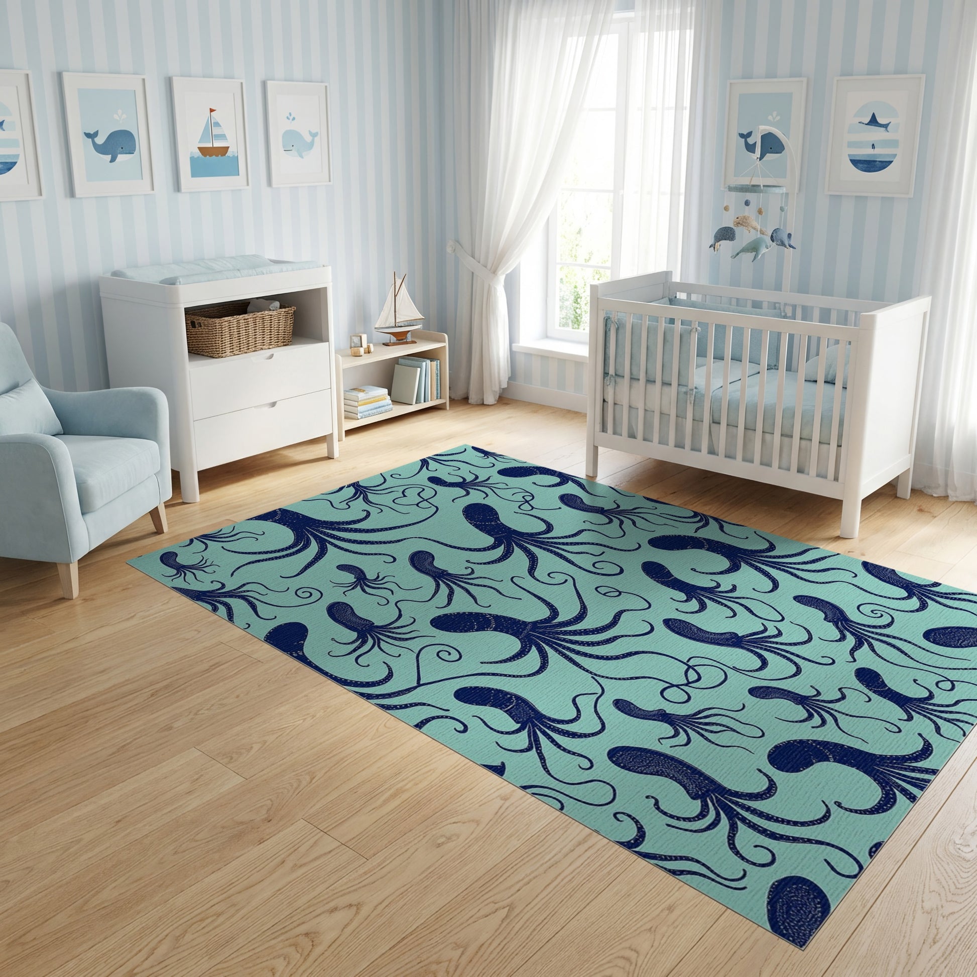 Flatwoven High Traffic Area Rug, Teal Navy Octopus Tentacles Whimsical Rug, Non Slip, Stain Resistant, Washable Area Rugs for Study Room, Playroom, Bedroom Overview: